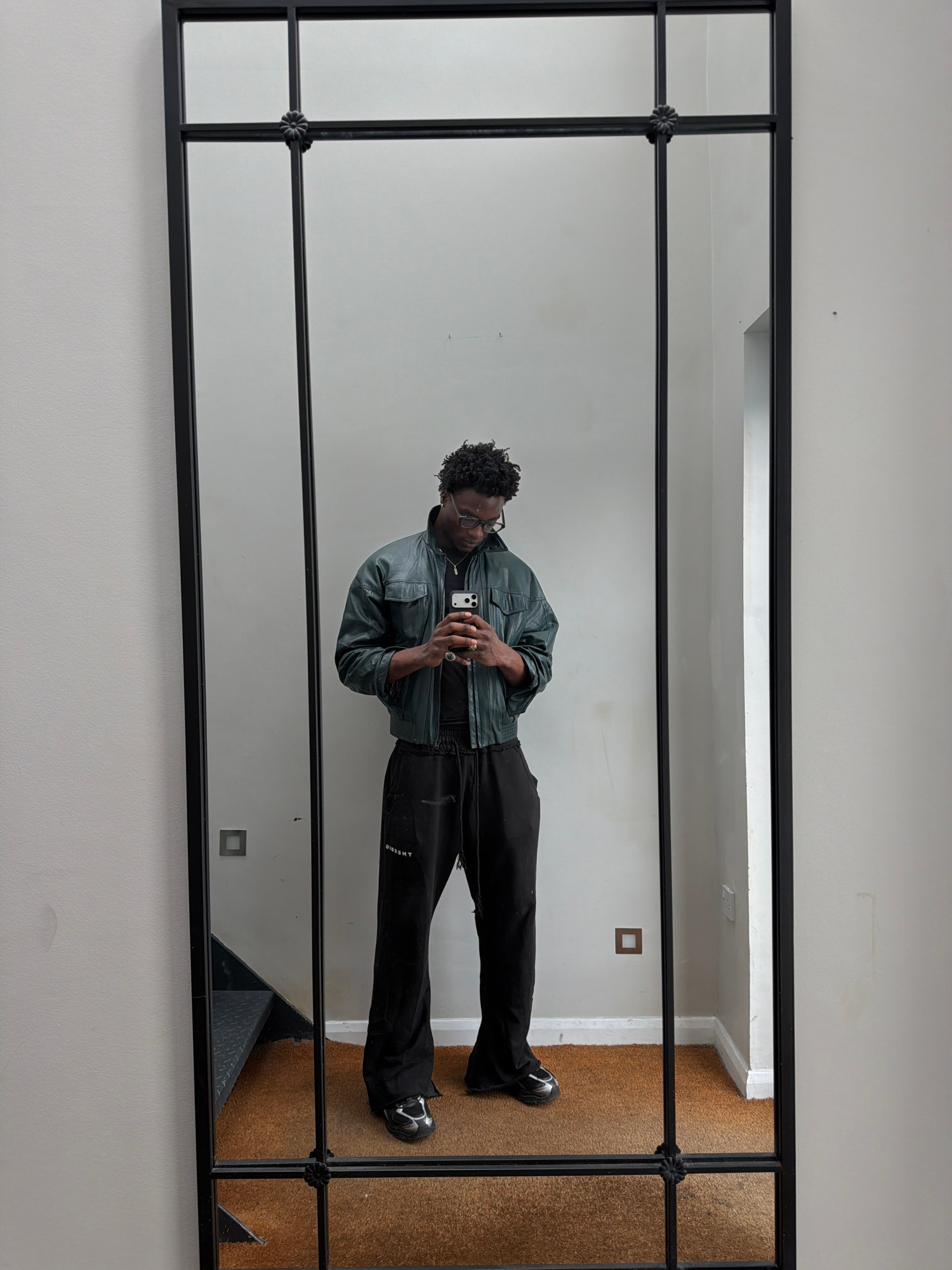 A person stands in front of a large mirror, taking a selfie. The mirror, with a black grid frame, reflects a hallway. The hallway has light beige walls, a section with brown carpet and a staircase. Th…read more