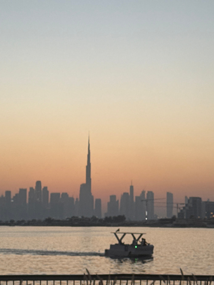 A hazy, skyline view displays numerous buildings, including a prominent, pointed structure. A body of water reflects the muted cityscape. In the water, a dark platform with X-shaped supports is visibl…read more