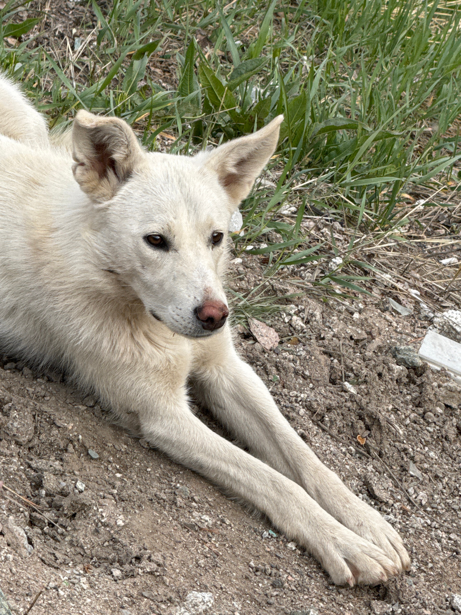 A light-colored dog is lying down outdoors, viewed from a slightly elevated angle. The dog, likely a young adult, has short to medium-length white or cream-colored fur. Its head is tilted upwards and…read more