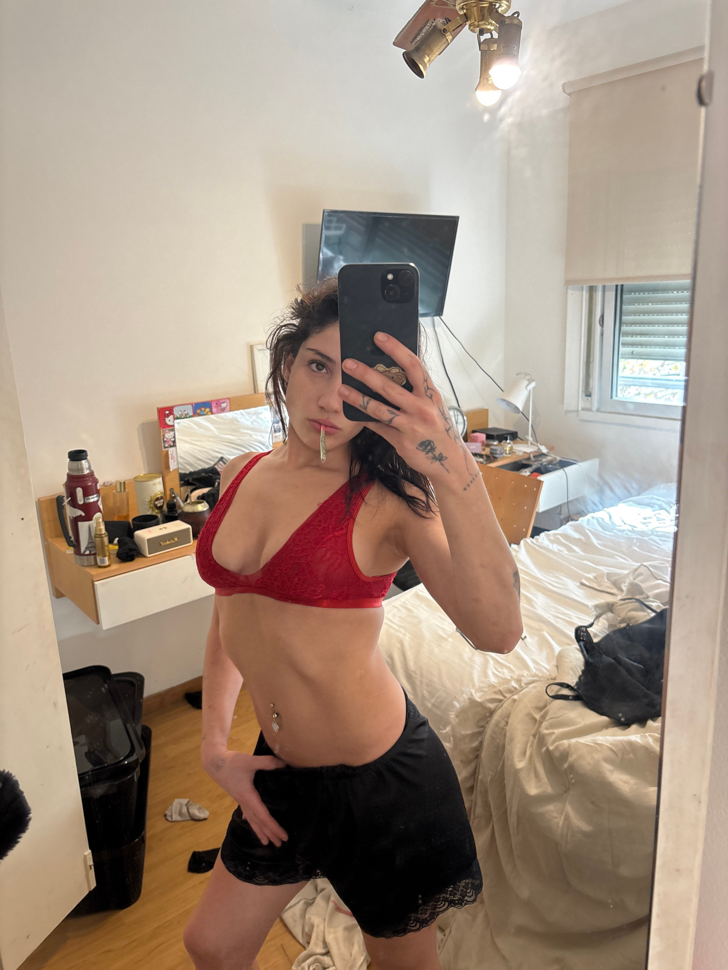 A woman is taking a mirror selfie in what appears to be an apartment. She is wearing a red bra and black shorts. She holds a cigarette in her mouth. There is a bed, a TV, a fan, and a window visible i…read more