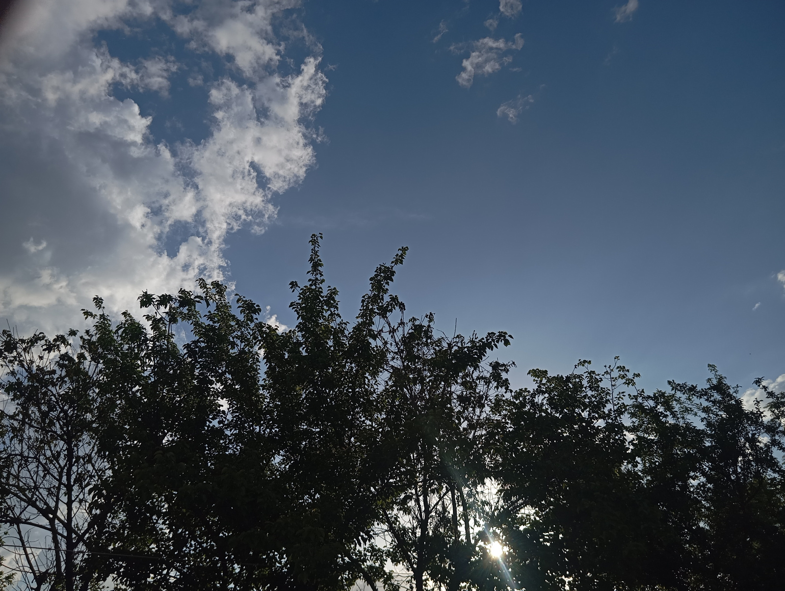 The image depicts a daytime scene in Lassan, Pakistan, showing the tops of trees silhouetted against a partly cloudy blue sky. Sunlight is visible shining through the branches of the trees. There are…read more