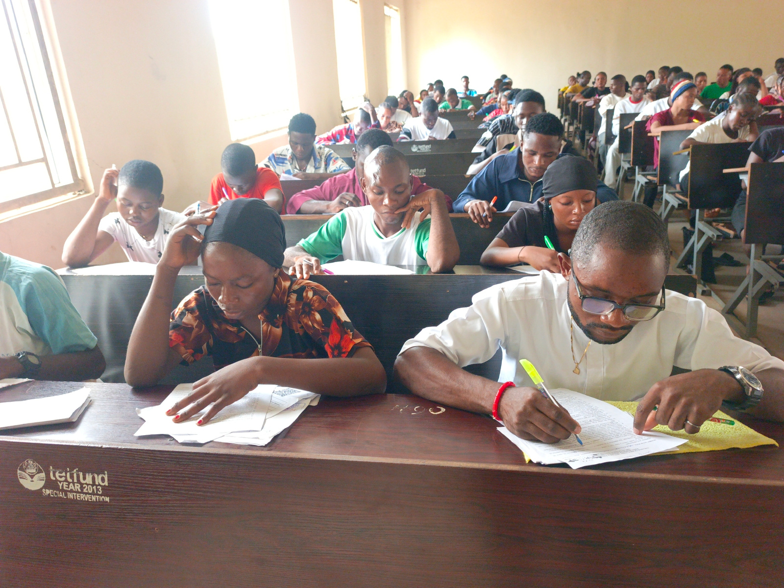 **Location:** Classroom in Akwanga, Nigeria. **Scene:** A classroom filled with students taking a test or exam. **People:** The image shows a large group of students, likely university or higher edu…read more
