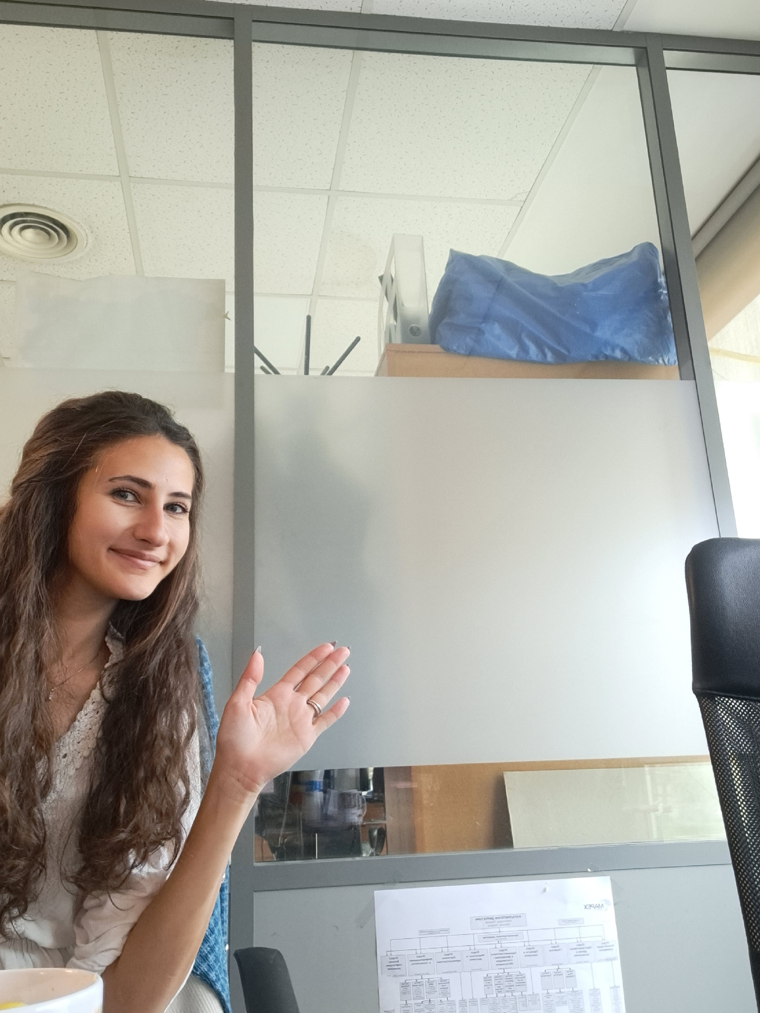 The image depicts a woman with long, wavy brown hair lying on a surface, possibly a desk or bed, in what appears to be an office setting. The woman is smiling and waving, with a ring visible on her fi…read more