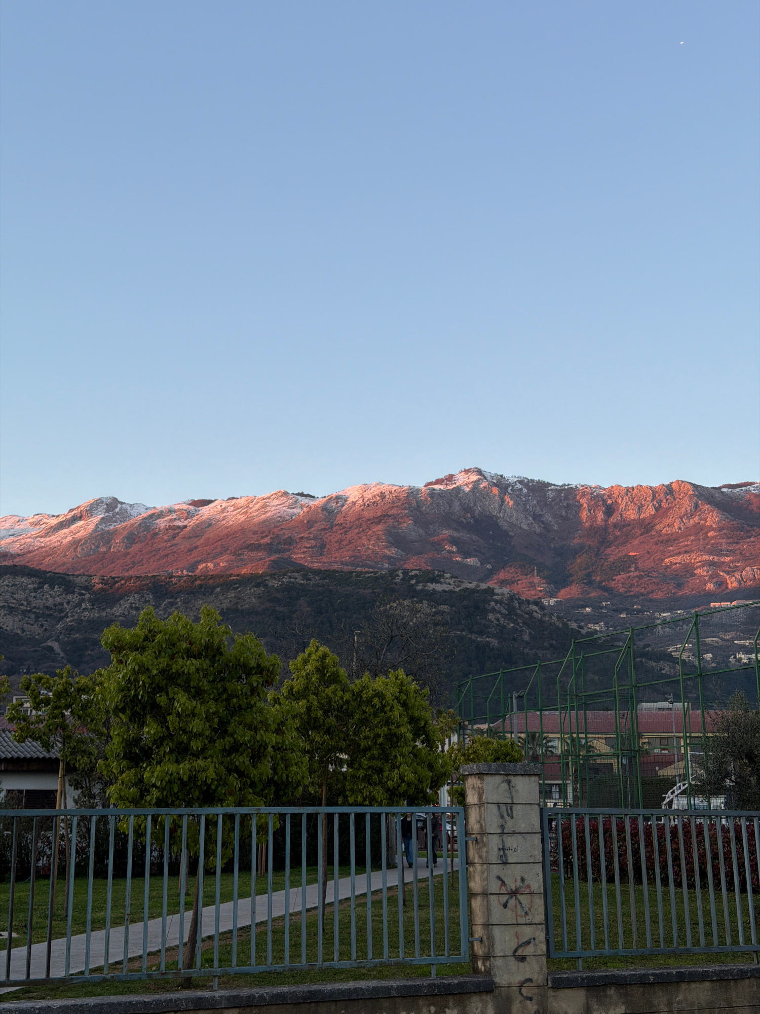 The image depicts a mountain range with reddish hues under a clear blue sky, adjacent to urban infrastructure. A green fence and a pathway run parallel to the mountain's base. Trees are visible near t…read more