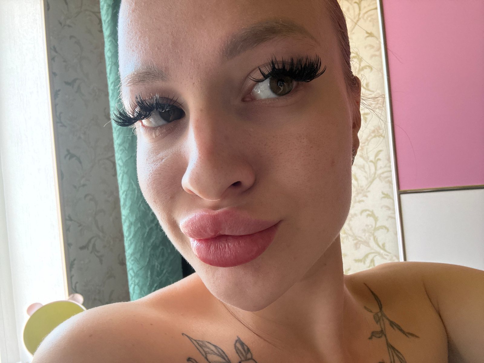 A close-up, eye-level selfie shot shows a young adult female. She has light skin, light brown hair, and prominent false eyelashes. Her lips are full and appear to have been augmented with filler. She…read more