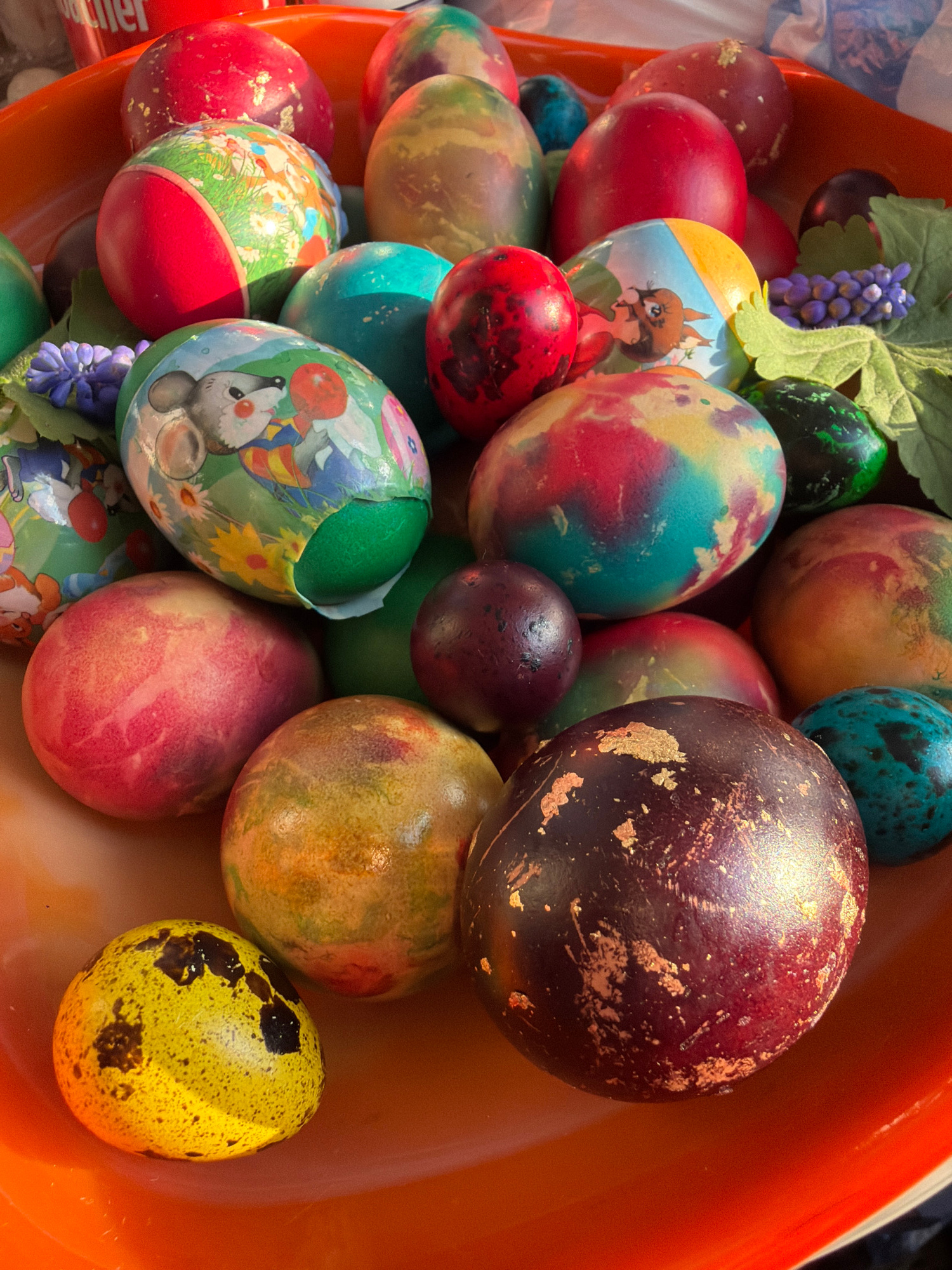 The image shows a collection of Easter eggs in an orange container. The eggs vary in color and decoration, including solid red, yellow with black speckles (resembling a quail egg), tie-dye patterns ofโฆread more