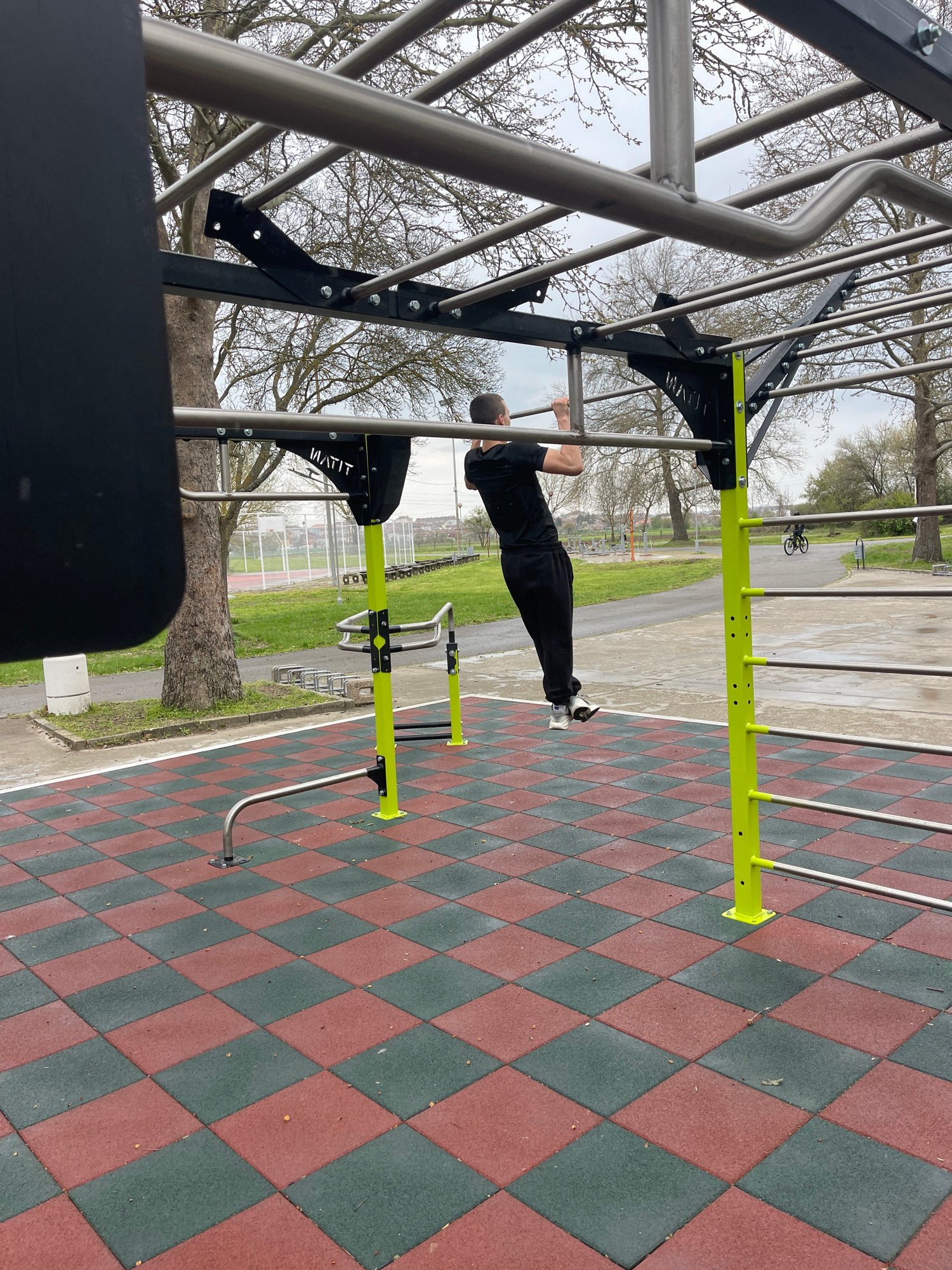 A man in black clothing performs a pull-up on a steel bar structure in an outdoor fitness area, likely in Elhovo, Bulgaria. The structure has a black and yellow frame with multiple steel bars. The gro…read more