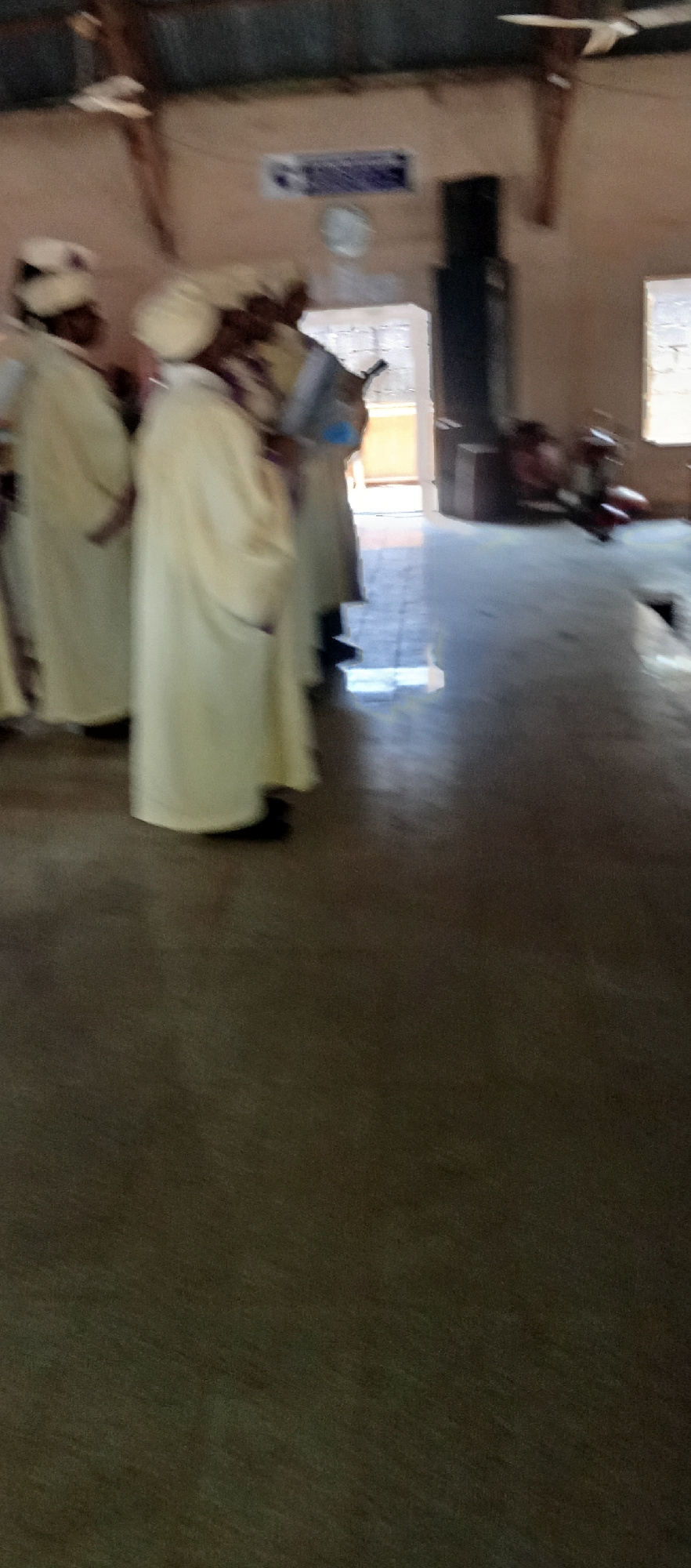 The image shows a group of men in white robes and turbans standing inside a building, possibly a church or religious institution, in Akwanga, Nigeria. The building appears to be a simple structure wit…read more