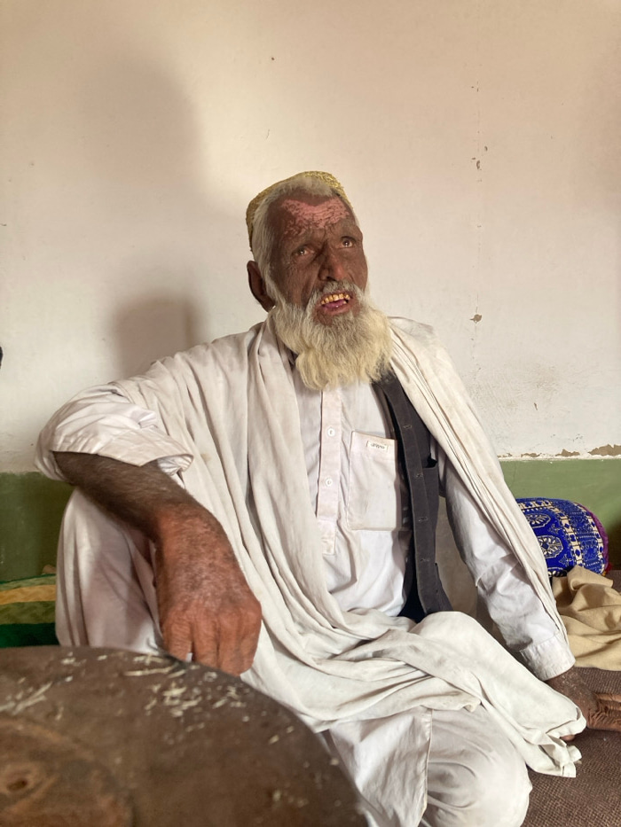 An elderly man with weathered skin and a long white beard is seated indoors. He's dressed in a white garment with a darker fabric belt underneath. His head is tilted, and he's looking towards the came…read more