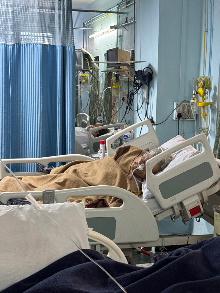 The image displays a hospital room setting with multiple beds. Two patients are visible, each lying in a hospital bed with medical equipment nearby, including monitors and various tubes. Blue curtains…read more
