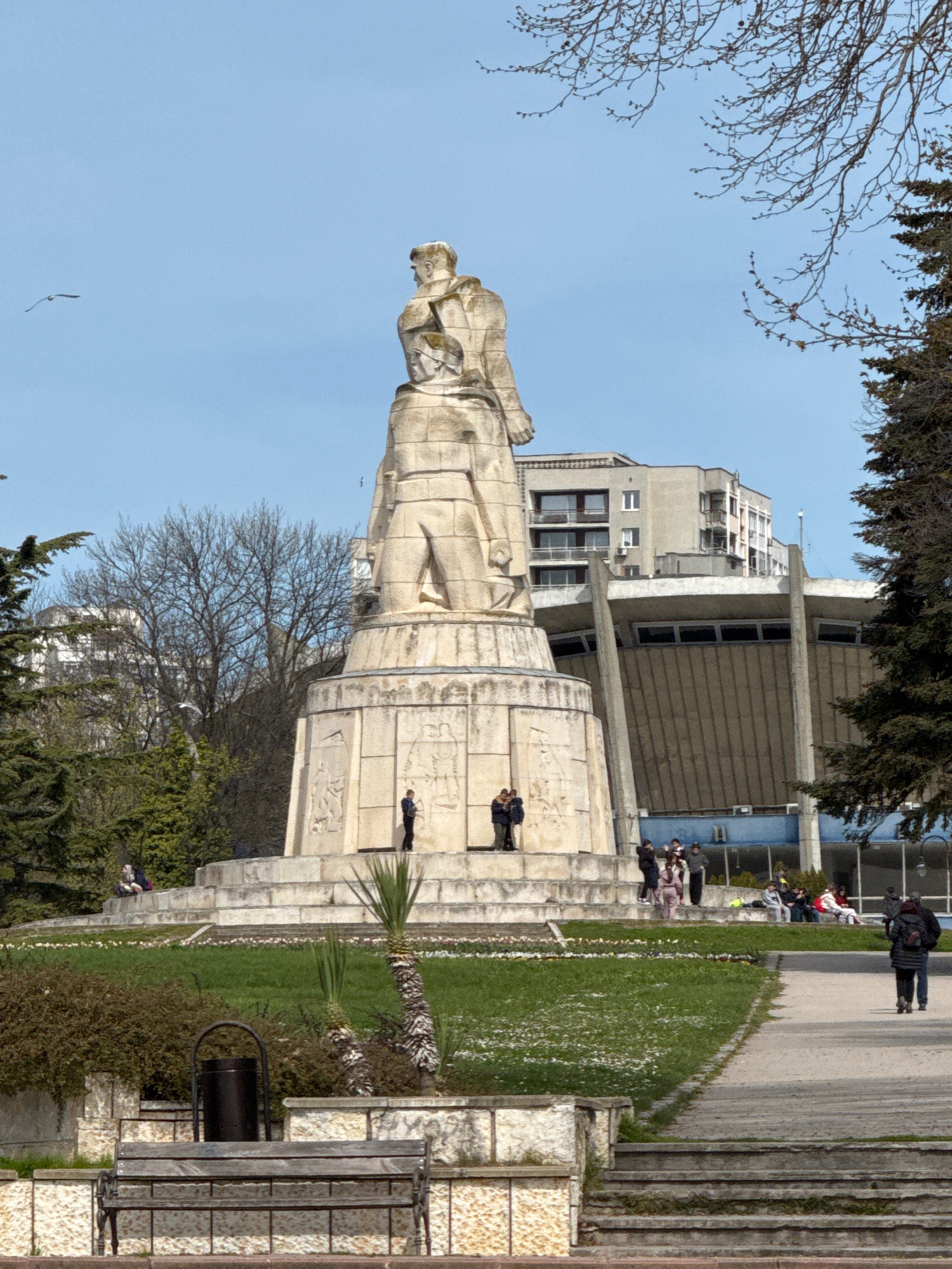 The image shows the Monument of the Soviet Army in Varna, Bulgaria, from a ground-level perspective. The monument is a large, light-colored stone structure topped with a statue of a soldier. A crowd o…read more