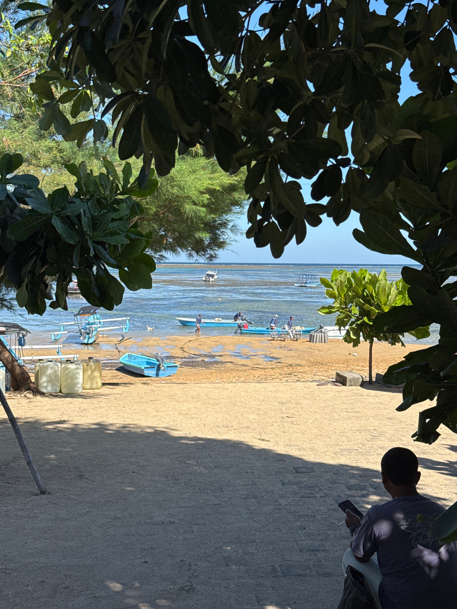 The image, taken in Denpasar, Indonesia, presents a sunlit coastal scene. Dark green foliage from trees frames the top and bottom of the view, suggesting the vantage point is beneath an overhead canop…read more
