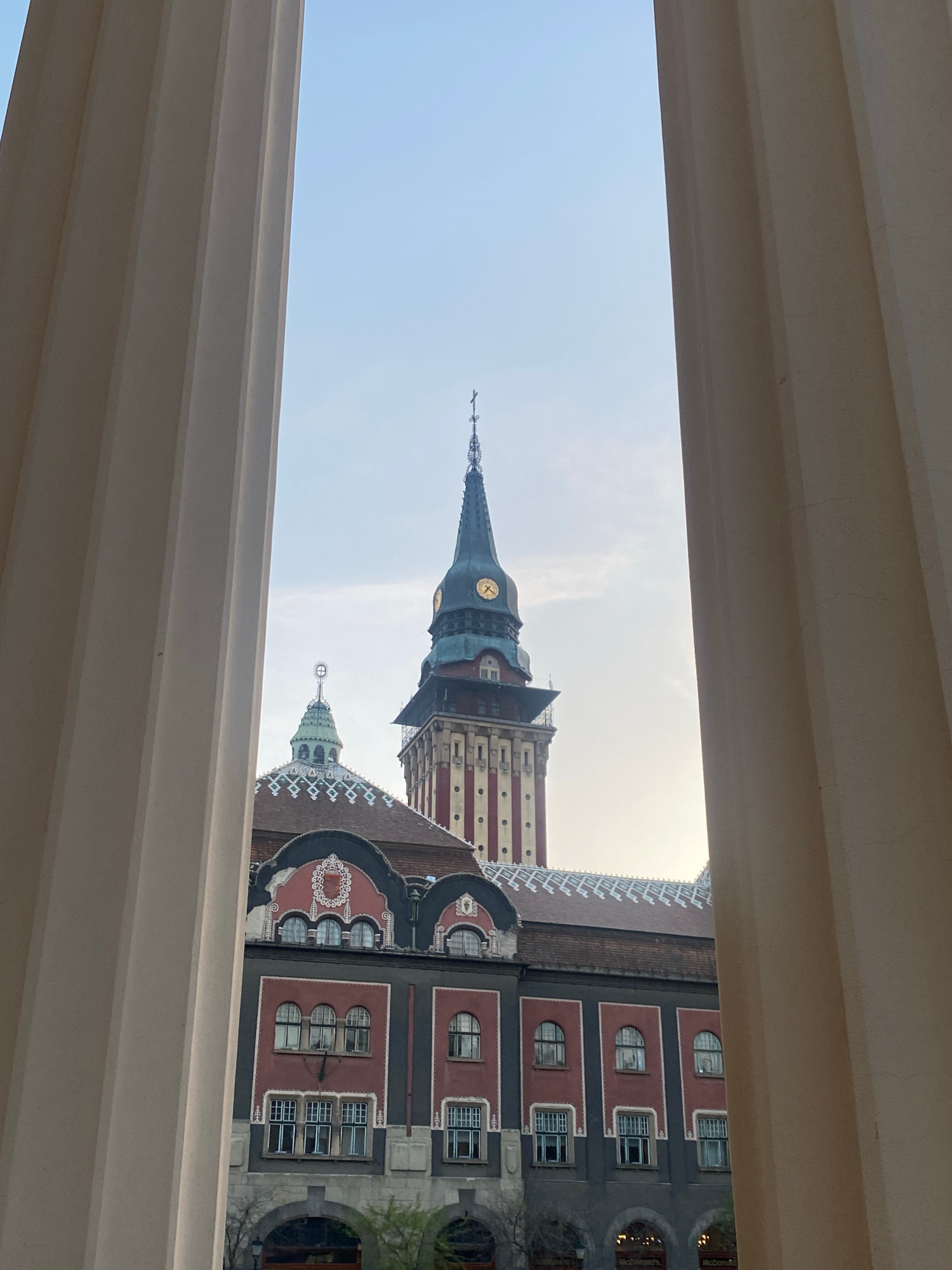 The image shows a view of the Subotica City Hall in Subotica, Serbia, framed by architectural elements, likely pillars or parts of a building. The City Hall's tower, distinguished by its pointed spire…read more