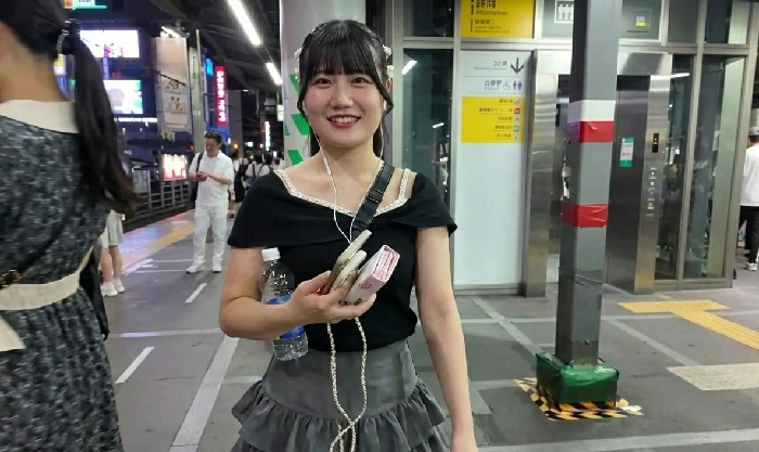 The image captures a bustling indoor public space, identified as a concourse or platform within Shibuya Station, Shibuya, Japan. A young East Asian female is positioned centrally in the foreground, sm…read more