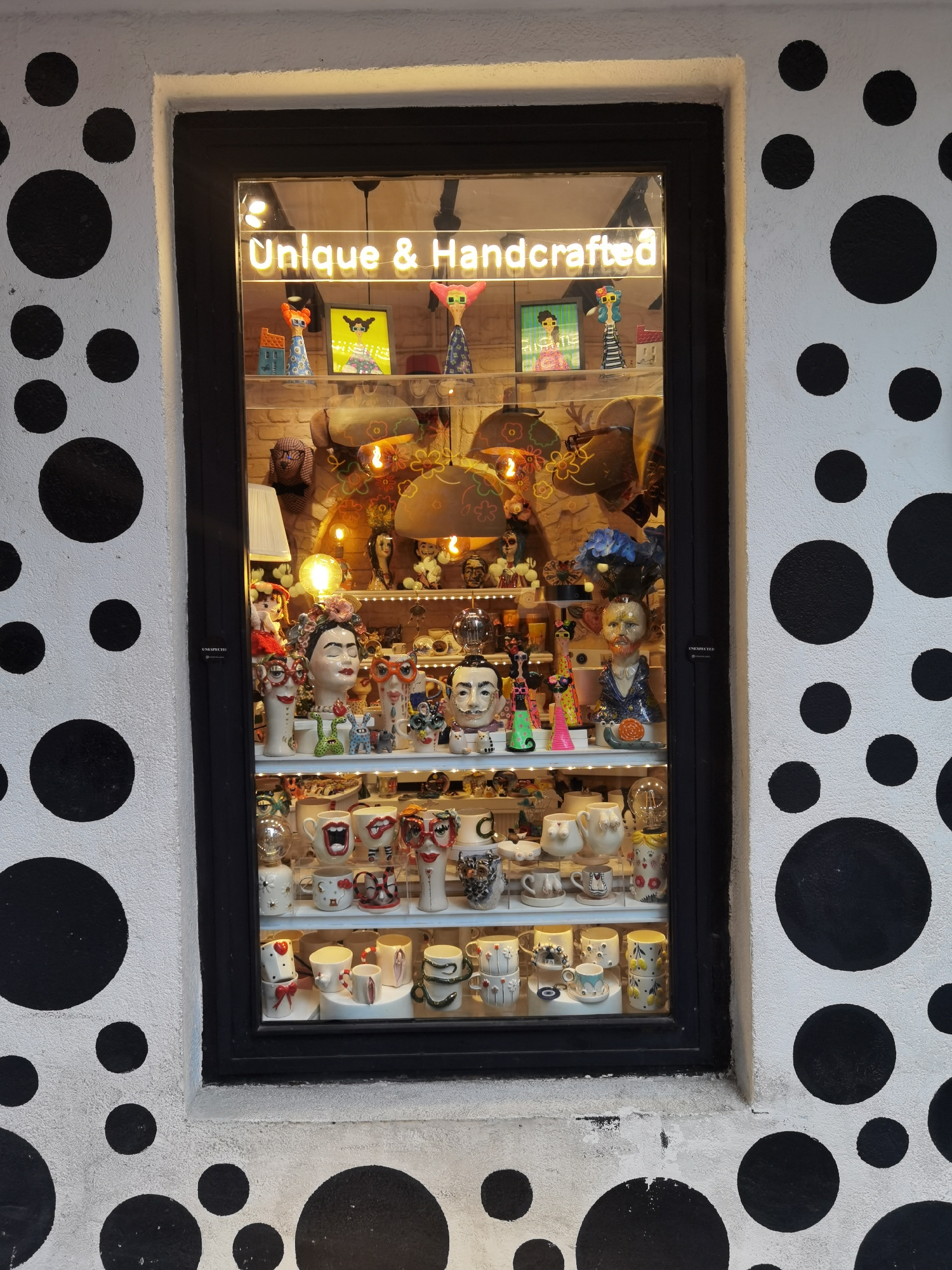 A vibrant shop window showcases an array of "Unique & Handcrafted" artistic items. The exterior wall surrounding the window is painted white and adorned with irregular black polka dots, giving it a pl…read more