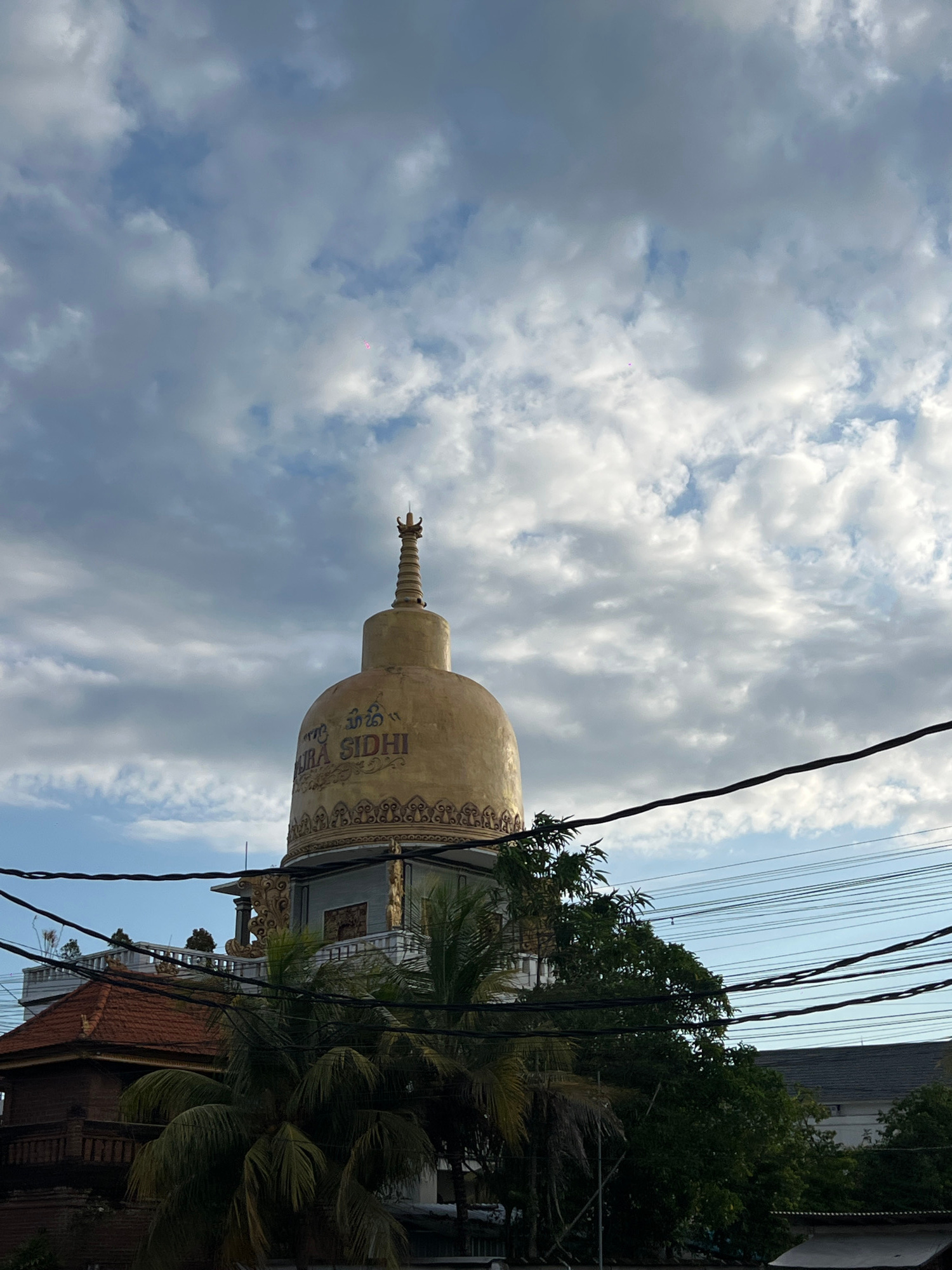 The image depicts a golden stupa, likely part of a Buddhist temple complex, in Mengwi, Indonesia. The stupa is partially obscured by trees and power lines. The sky is cloudy with patches of blue. Othe…read more