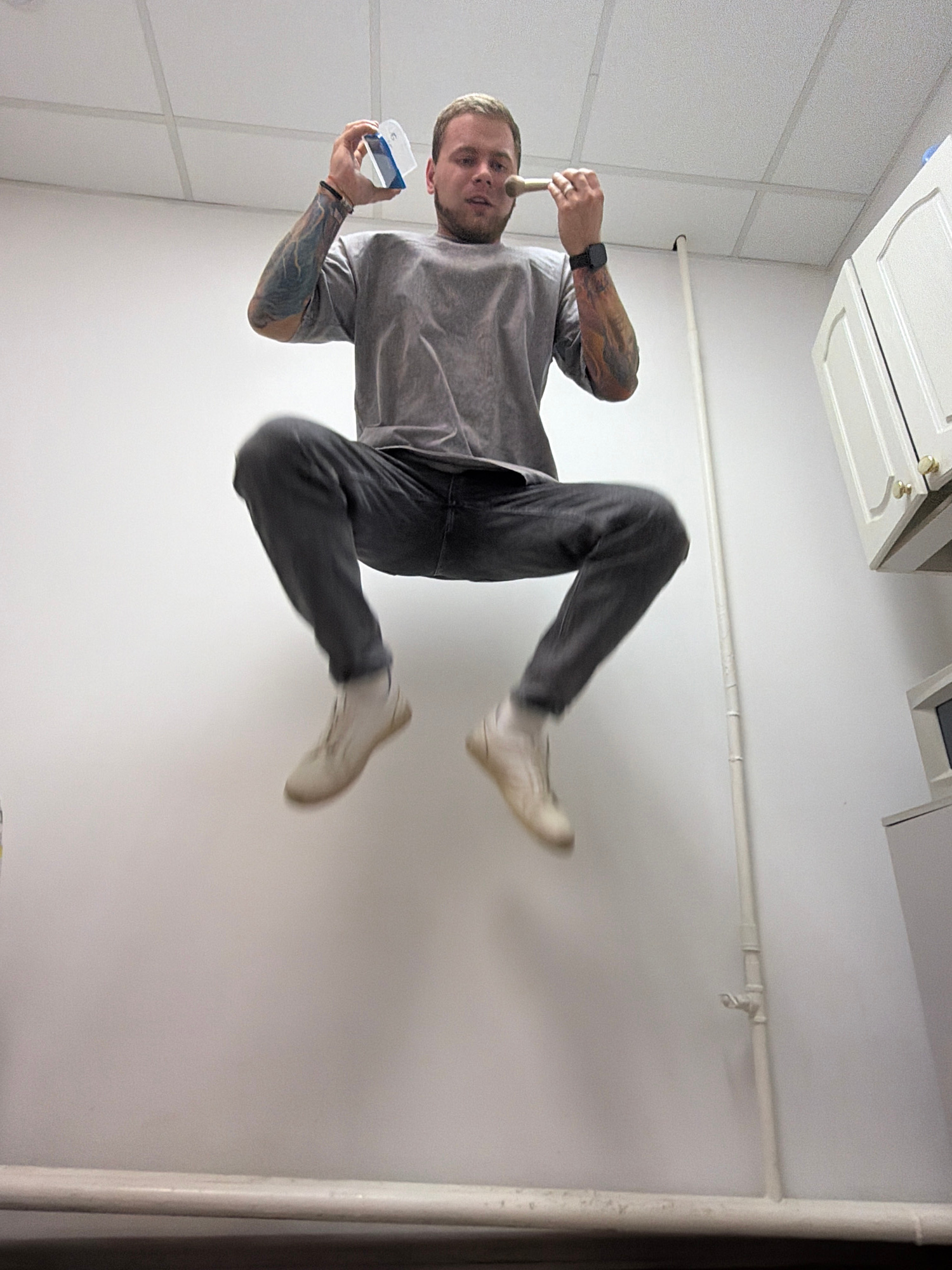 A man with light hair and tattoos on his arms is captured in a motion blur mid-air, as if jumping or falling, inside a room. He is wearing a gray t-shirt, dark jeans, and light-colored boots. In his h…read more
