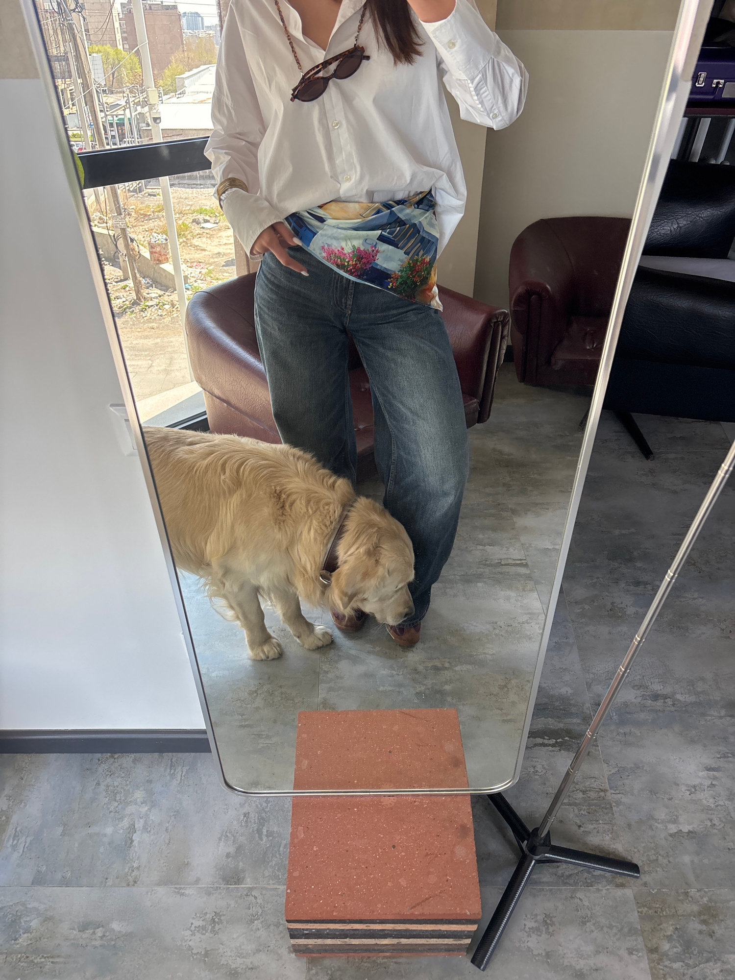 This image, taken in Zovuni, Armenia, presents a reflective view of a person and a dog within an indoor setting. The scene is captured as a mirror selfie, showcasing the subjects and their surrounding…read more