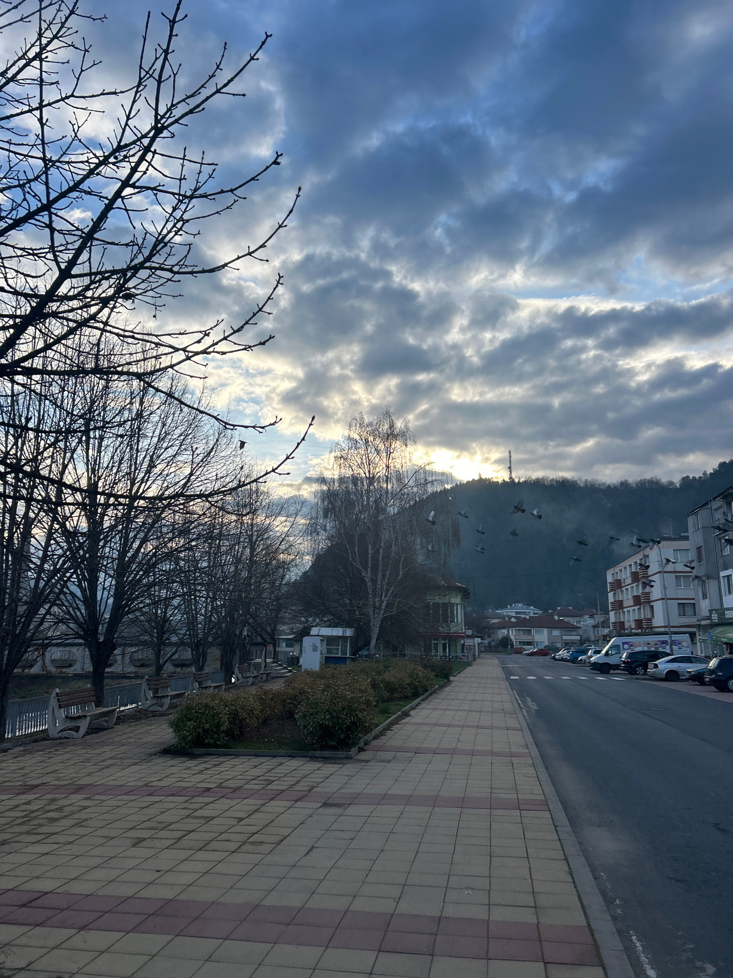 The image shows an urban scene in Zlatograd, Bulgaria. A paved sidewalk runs along the right side of the frame, next to a road with parked cars. Adjacent to the sidewalk are small bushes and bare tree…read more