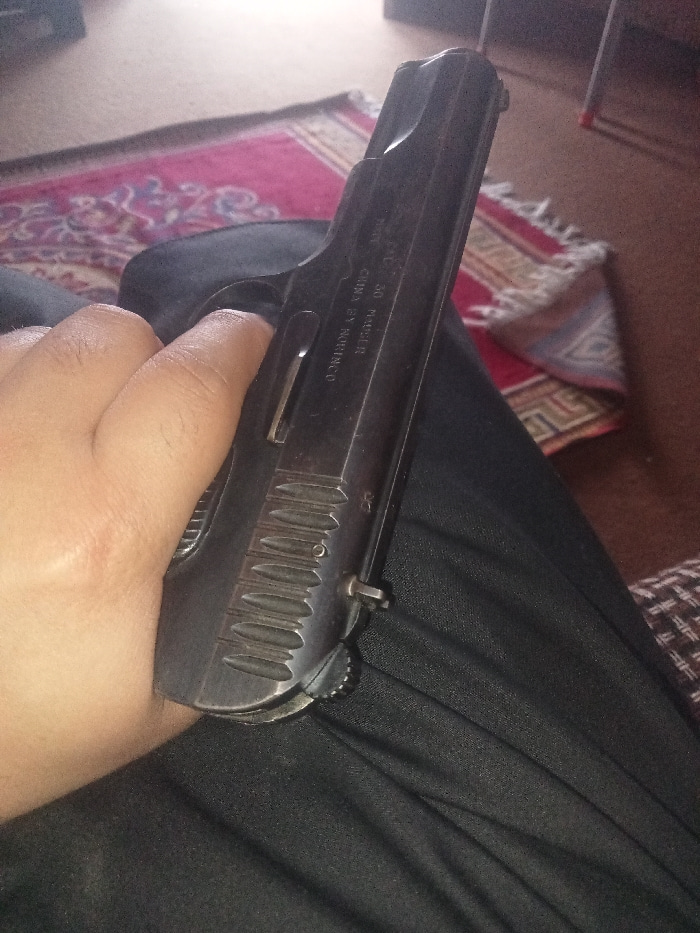 The image presents a high-angle, close-up view of a dark-colored pistol held in a human right hand. The pistol features a metallic finish and bears visible inscriptions on its left slide, identifying…read more