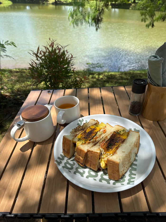 A serene outdoor scene presents a wooden table with a picturesque lake view. A plate of sliced sandwiches, likely egg-based, sits beside a cup and a small teapot, suggesting a meal. A pepper grinder a…read more