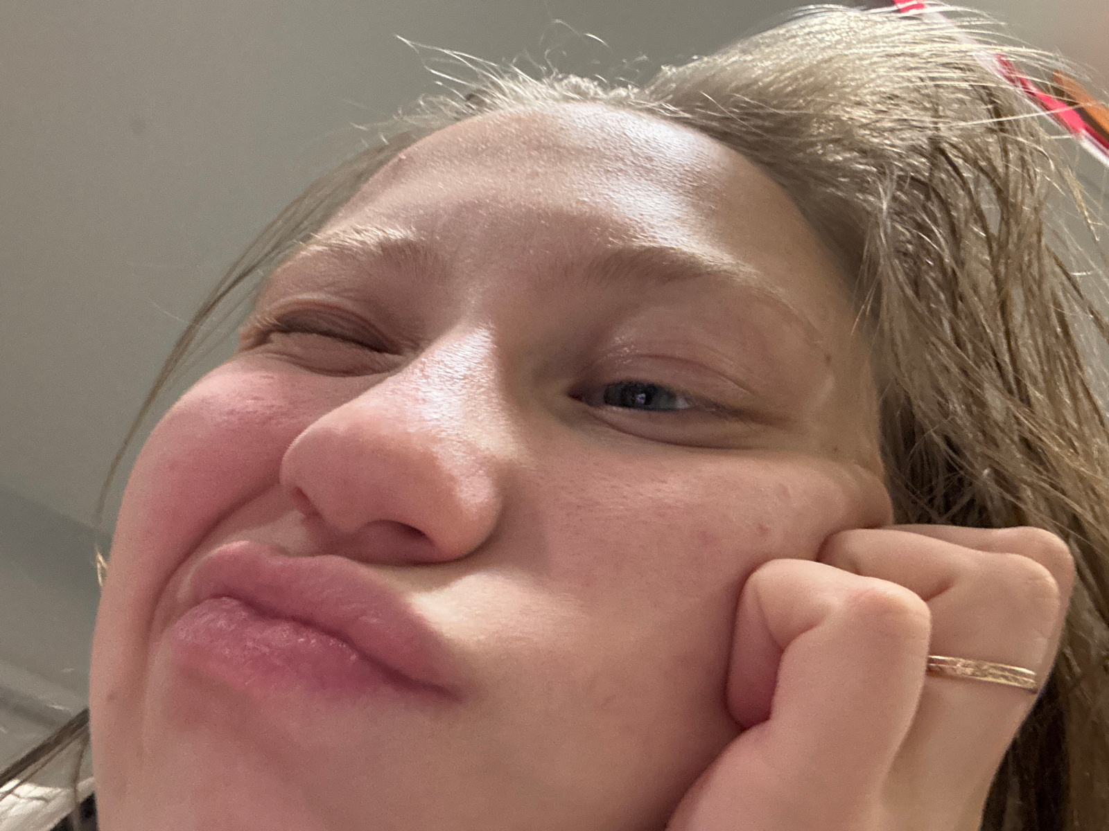 A close-up, angled selfie shows a fair-skinned person with blonde hair. The person's right eye is partially closed in a wink. They have a ring on a finger that is being used to push the skin of their…read more
