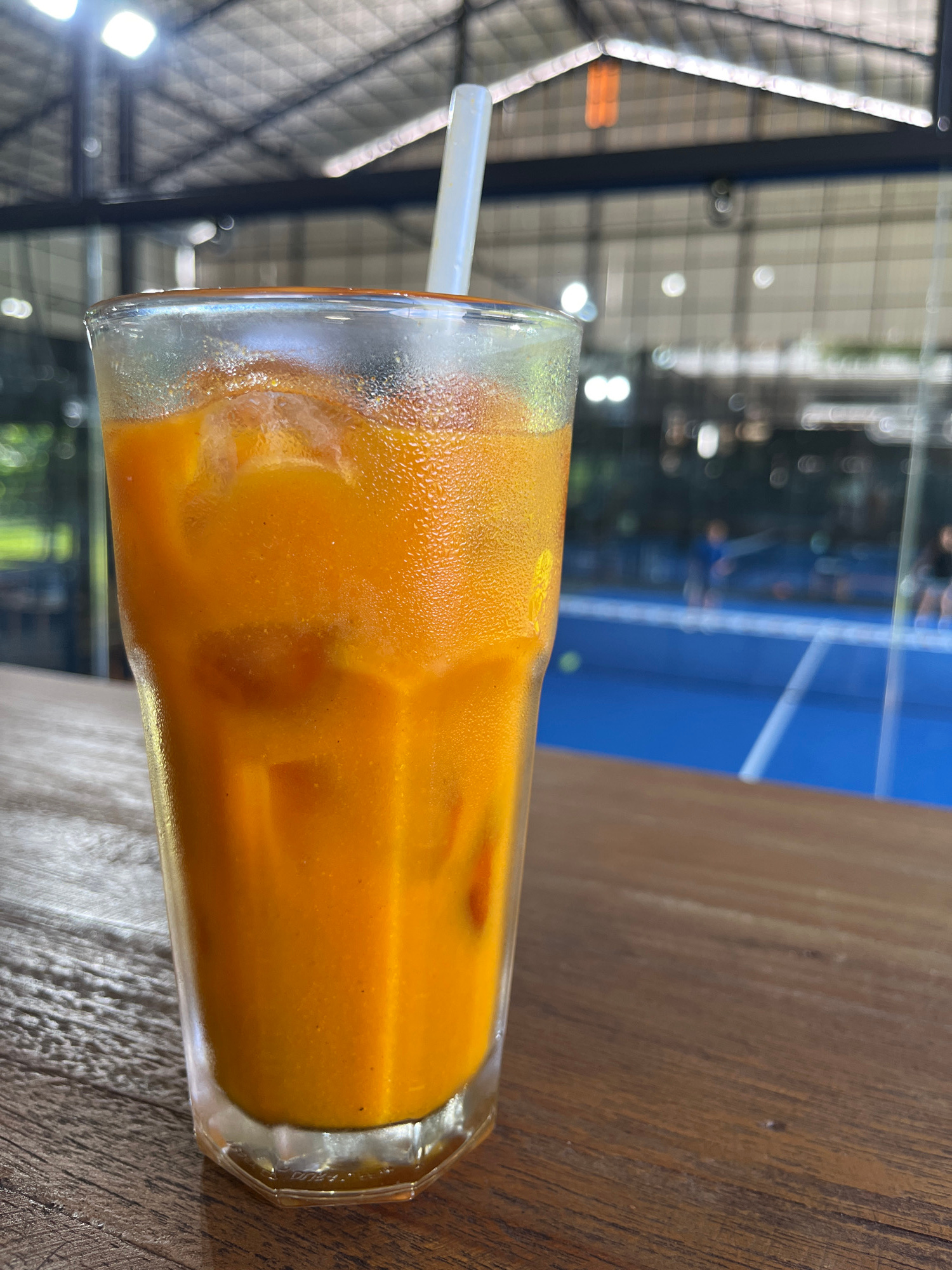 The image displays a tall glass of an orange-hued iced drink, likely a Thai iced tea given its distinct color and visible sediment, resting on a dark brown wooden table. The glass is clear and heavily…read more