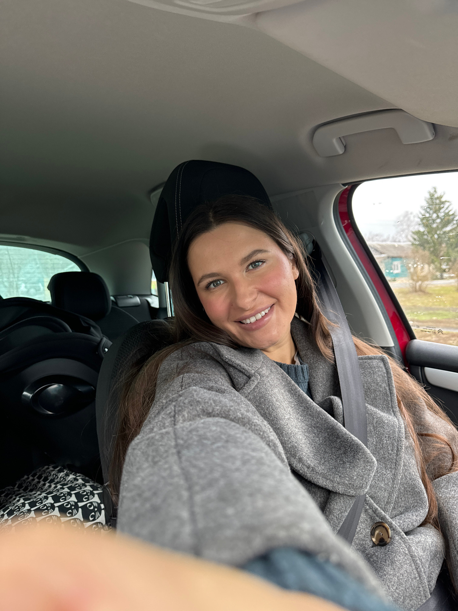A woman wearing a gray coat and a seatbelt is sitting in a car. Outside the car window is a view of a tree and a building in what appears to be Красный Маяк, Russia. The woman is smiling and looking a…read more