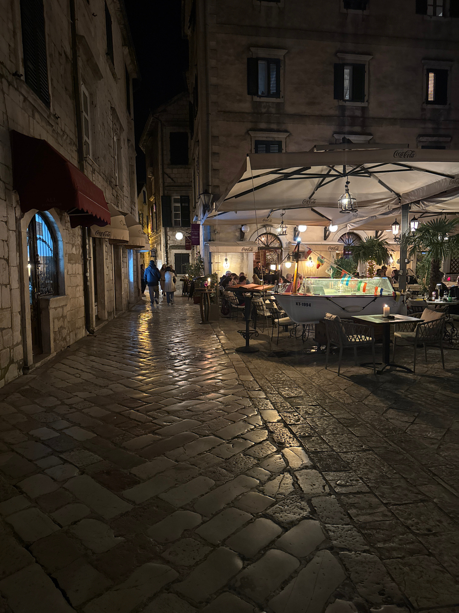 The image depicts a narrow cobblestone street at night in what appears to be the city of Kotor, Montenegro. Tall, light-colored stone buildings line either side of the street, with several windows vis…read more