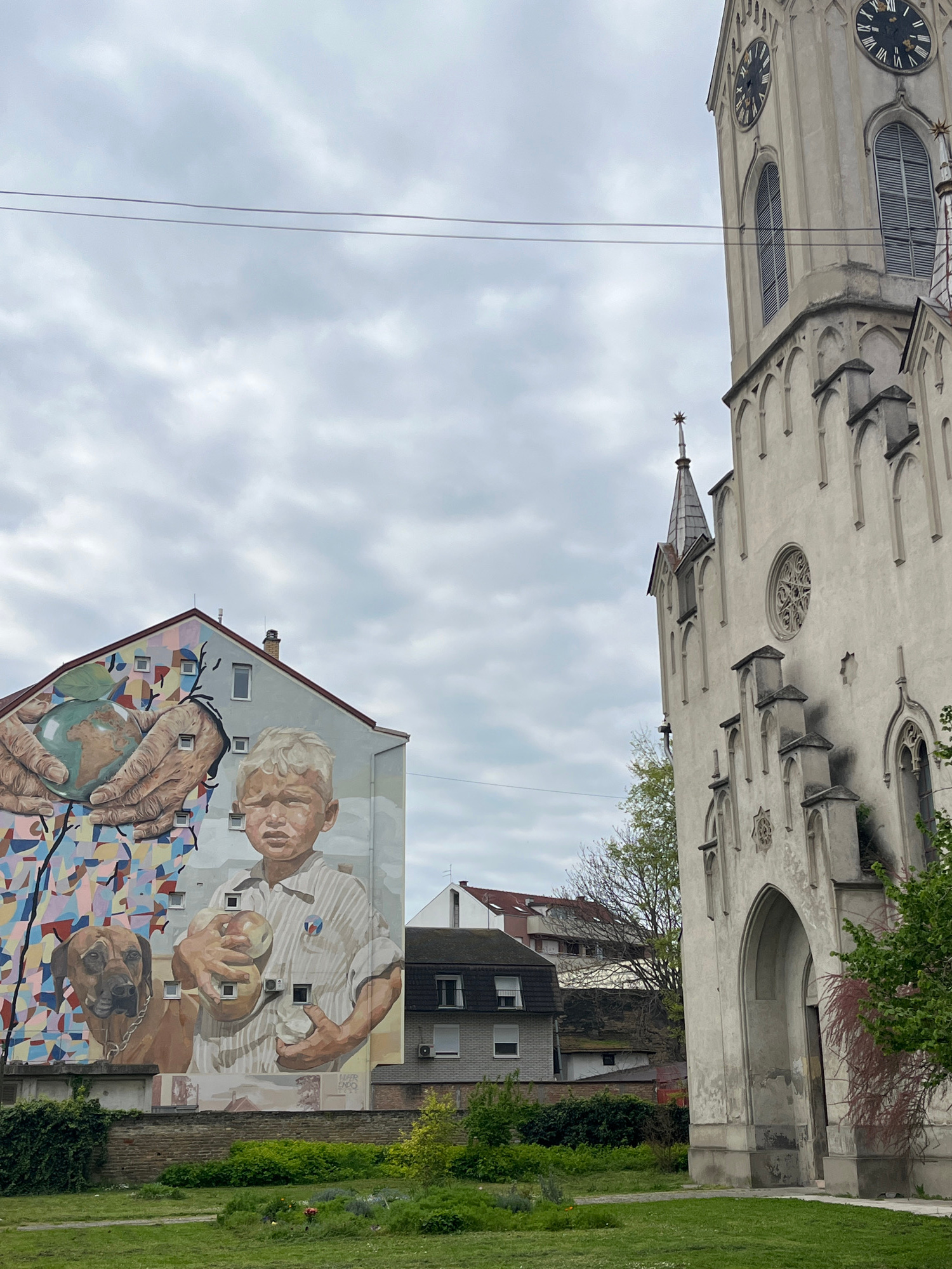 The image shows a view in Novi Sad, Serbia, featuring a building with a large mural juxtaposed with the iconic tower of the Name of Mary Church (Crkva Imena Marijinog). The mural depicts two elderly f…read more