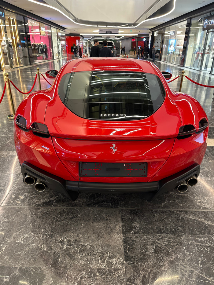 The scene captures a red Ferrari sports car, specifically a Ferrari Roma, displayed prominently from the rear within a modern, upscale shopping mall. The car features a glossy red finish, quad circulaβ¦read more