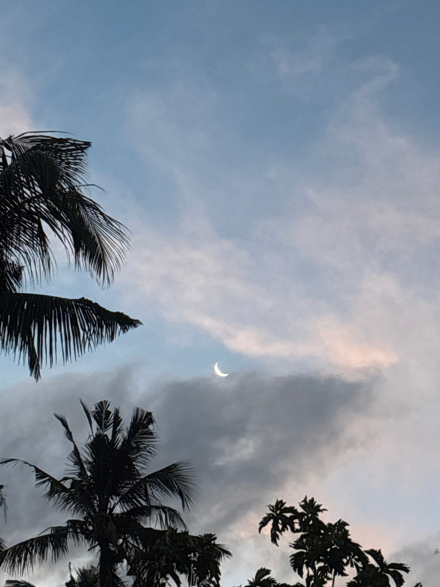 A serene outdoor shot captures a slender crescent moon positioned high in a cloudy sky, framed by the dark silhouettes of tropical trees. The sky presents a blend of soft blues, diffused grays, and su…read more