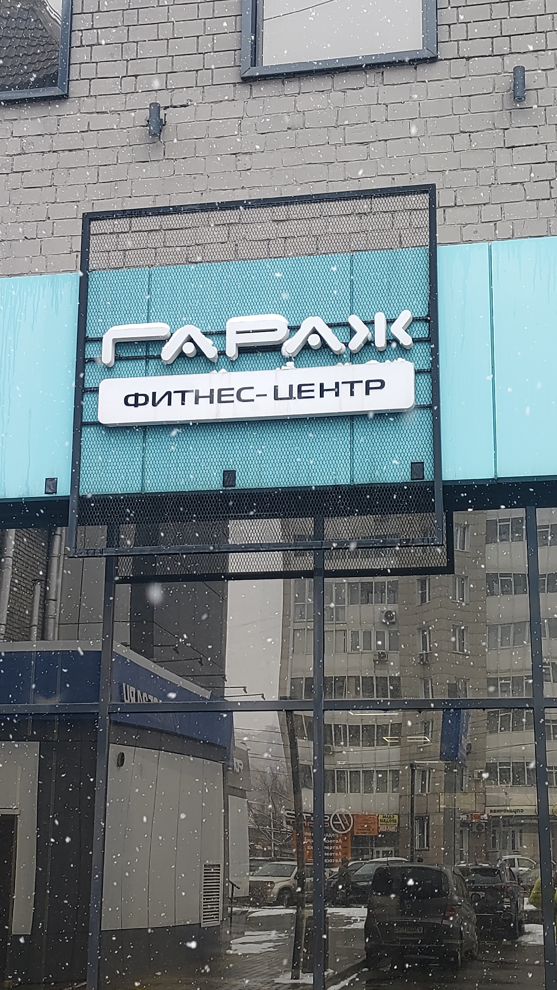 This daytime photograph, taken in Krasnoyarsk, Russia, depicts the exterior of a commercial building on a snowy winter day. Prominent snowflakes are visible throughout the image, falling through the a…read more