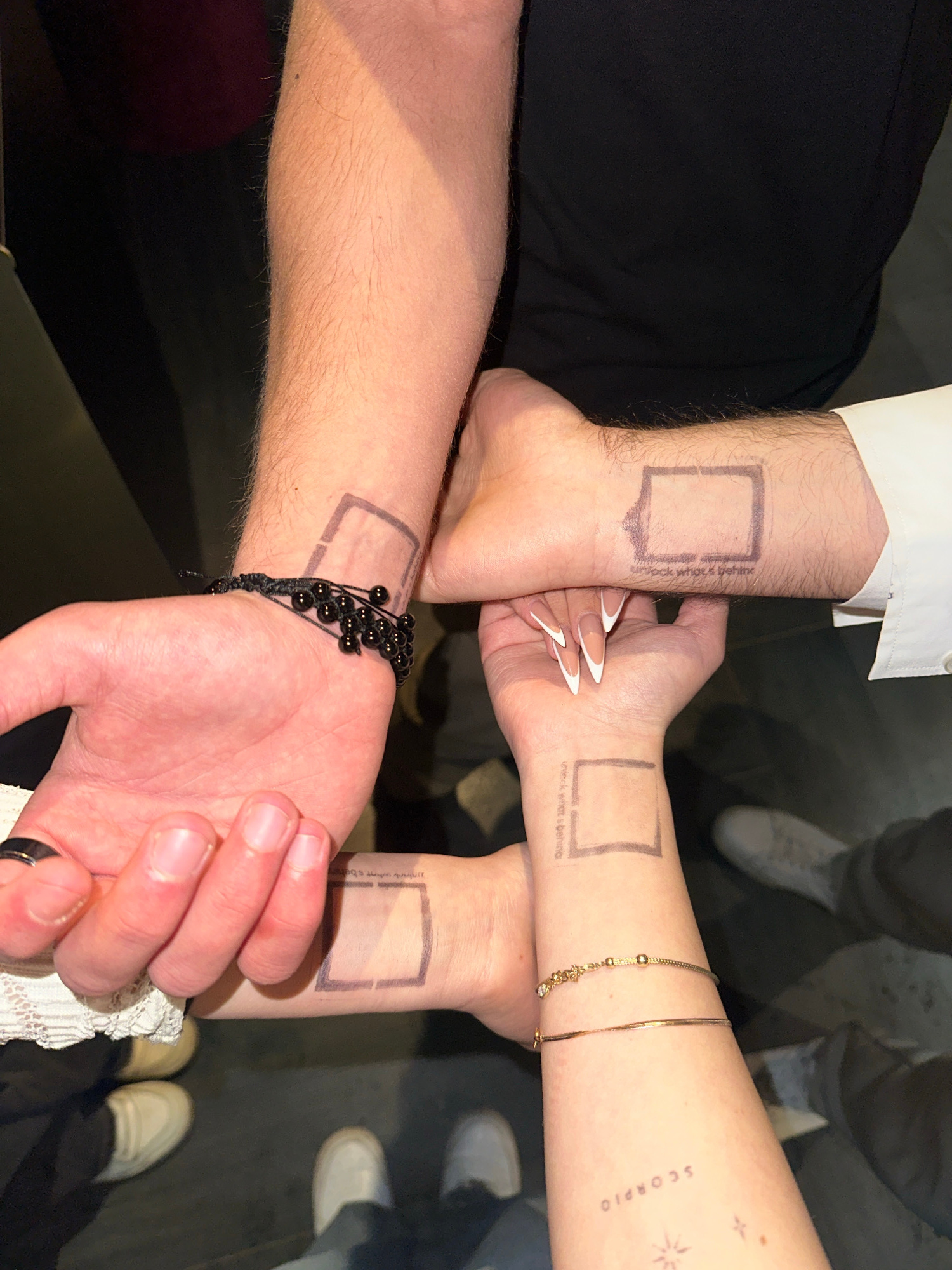 Four individuals' forearms and hands are partially visible in a close-up, top-down perspective, displaying their wrists. Each of the four wrists features a temporary mark: a stenciled, hollow rectangu…read more