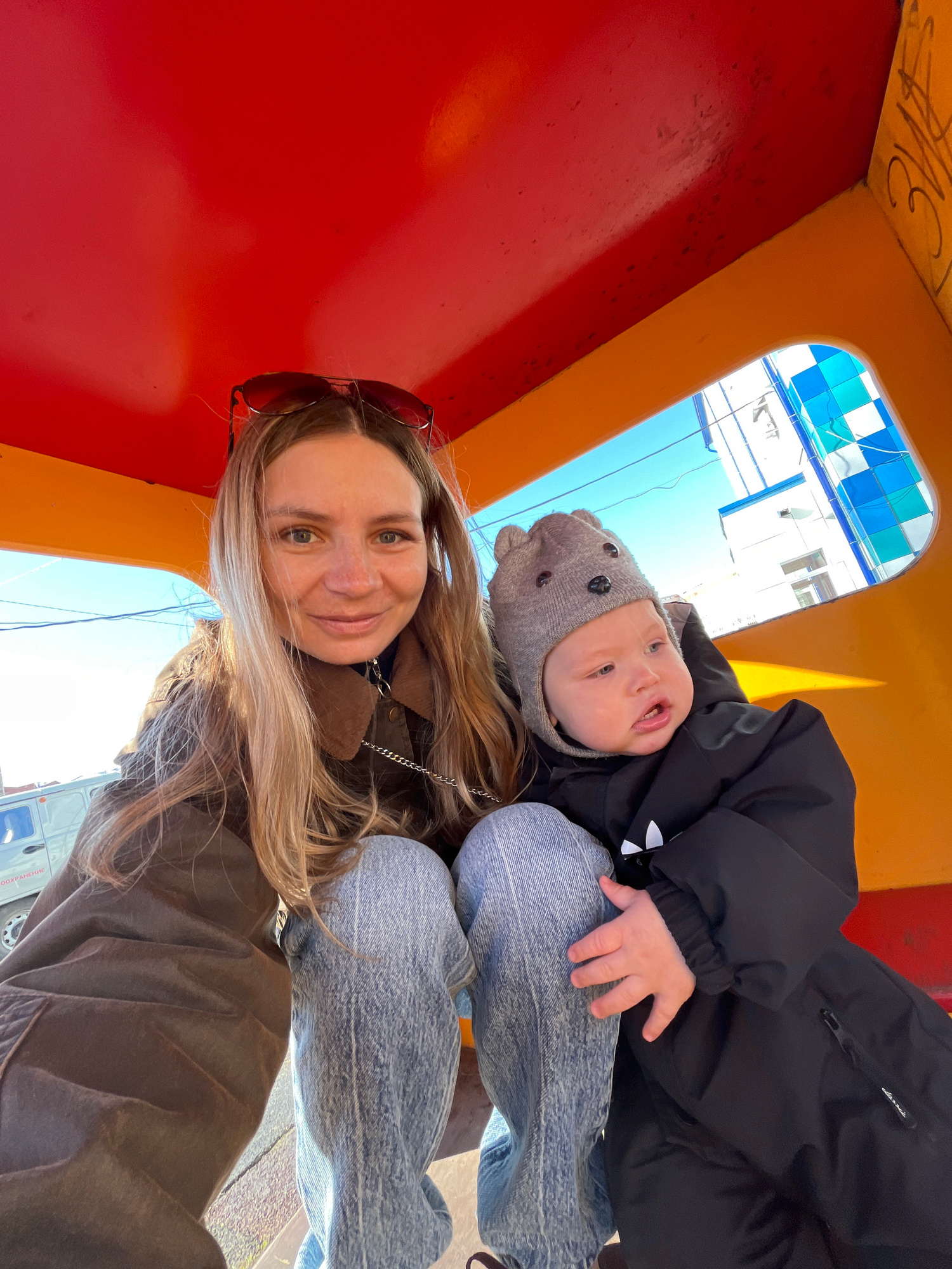 A selfie taken in Chaikovsky, Russia, shows a woman and a baby inside a playground structure. The woman is fair-skinned with long blonde hair and is wearing sunglasses on her head, a brown jacket, and…read more
