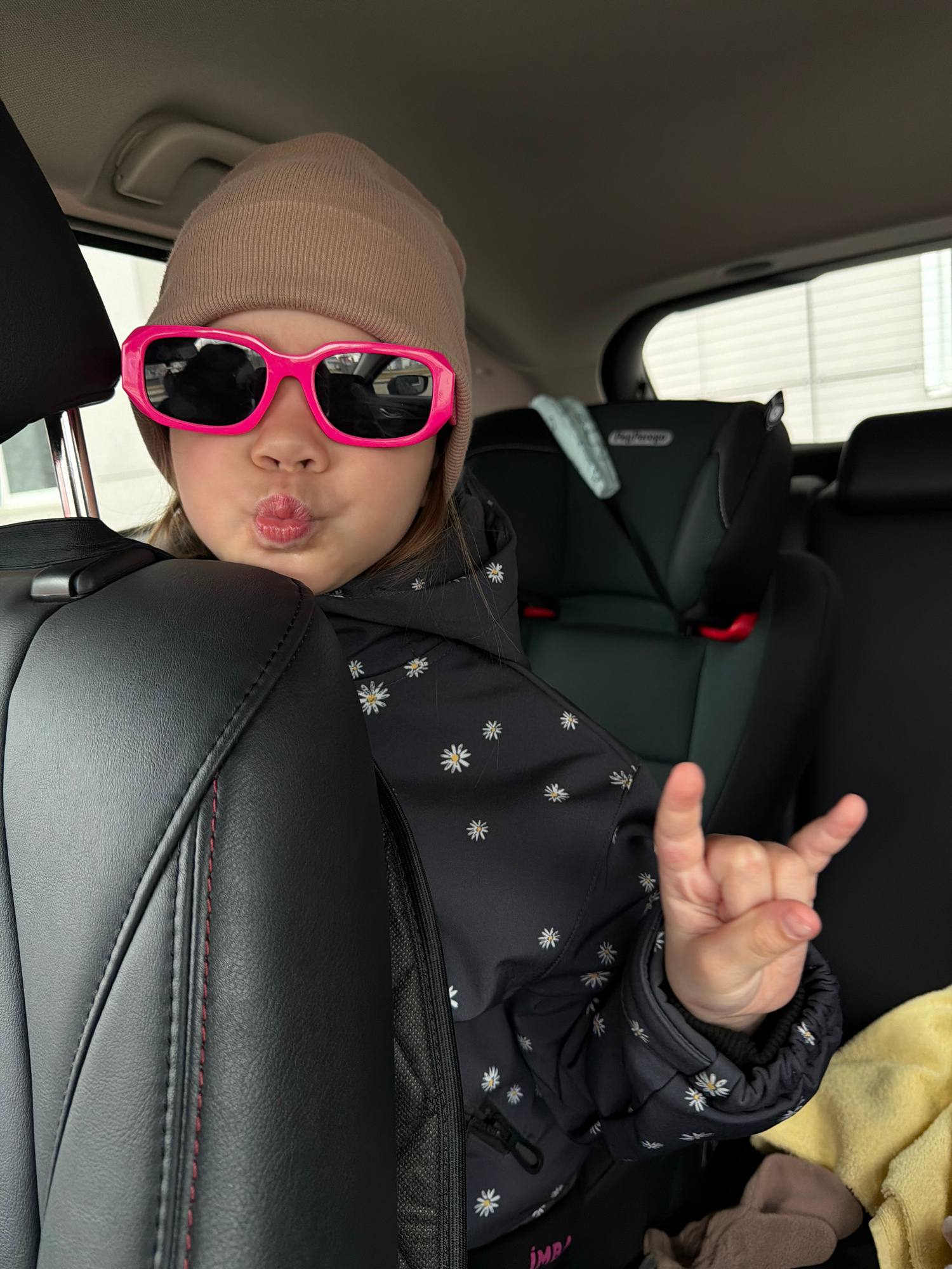 A young child is playfully posing in the back seat of a car in Chaikovsky, Russia. The child, wearing a beige beanie and large pink sunglasses, is dressed in a dark jacket patterned with white daisiesβ¦read more