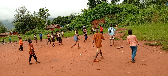 The scene depicts approximately twenty children, predominantly male, engaged in outdoor activity on a reddish-brown dirt clearing in the city of Ngalula, Democratic Republic of the Congo. The children…read more