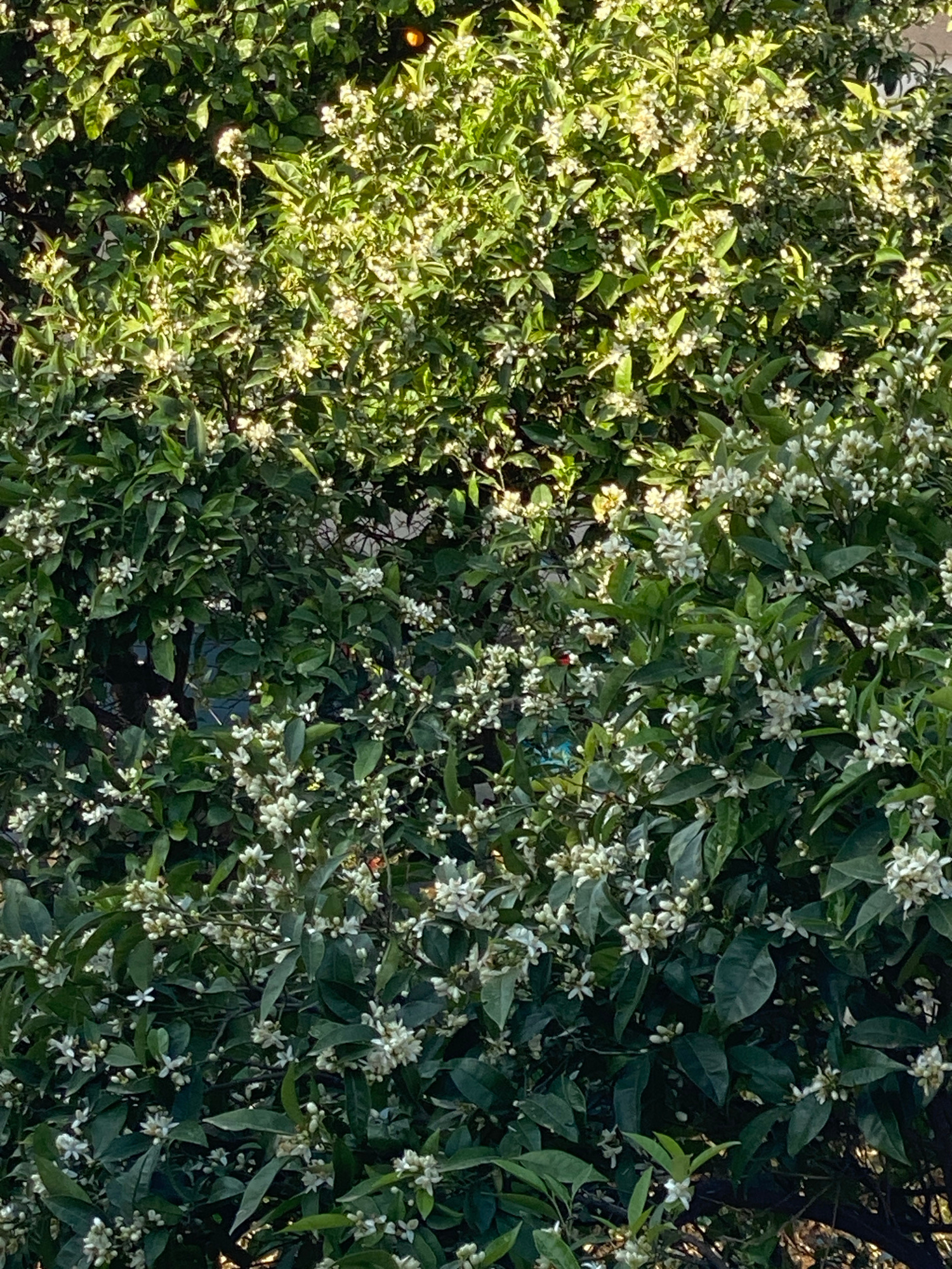 The image presents a close-up, overhead view of a densely foliated tree or shrub, generously covered in numerous small, white flowers. The scene depicts an outdoor natural environment, likely a garden…read more