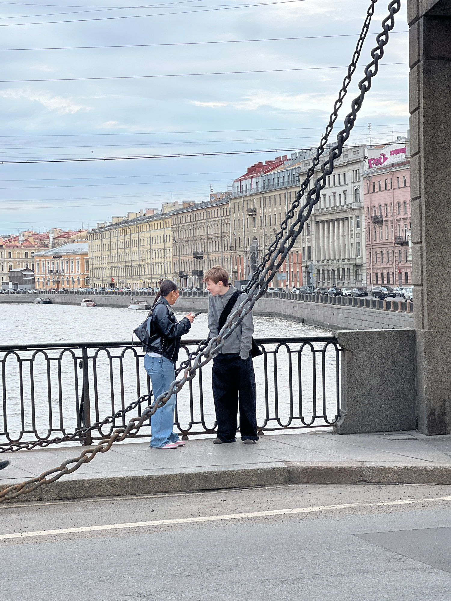 The image, when viewed correctly oriented, depicts two individuals standing by an urban canal or river in Saint Petersburg, Russia. The scene is captured from a slightly elevated position, possibly fr…read more