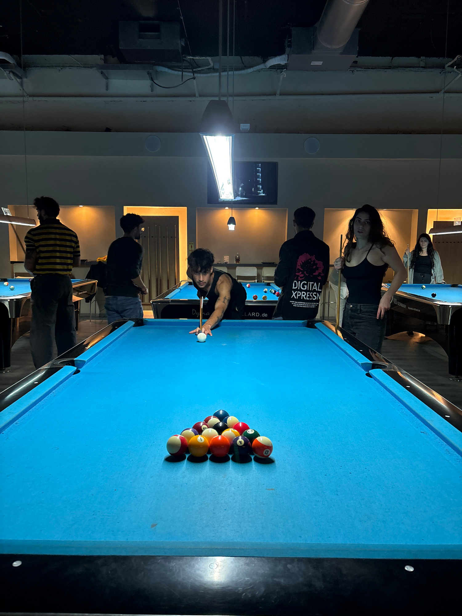 The image depicts a pool hall setting. Multiple individuals are present around a blue pool table. A person in the foreground is positioned to strike the cue ball, aiming towards a racked set of billia…read more
