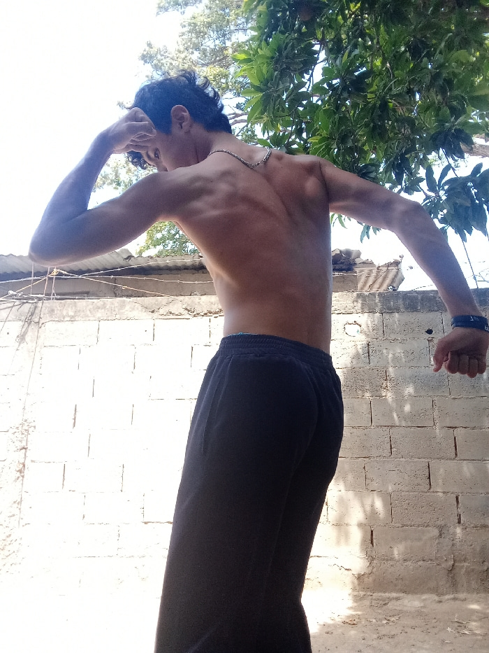 A male individual is depicted outdoors in Juan Griego, Venezuela. The subject is seen from the back, slightly angled, standing shirtless and wearing dark-colored sweatpants. He possesses a muscular ph…read more