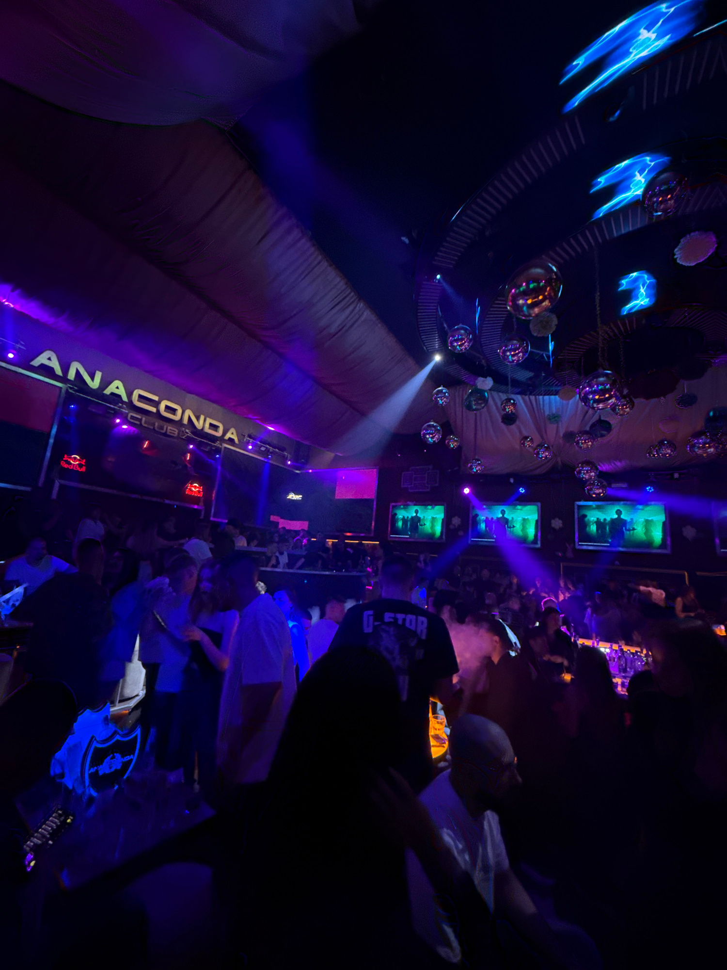 The image depicts the interior of Anaconda Club, located in Pleven, Bulgaria. The nightclub is dimly lit with blue and purple lighting effects. The ceiling is adorned with disco balls and projected li…read more