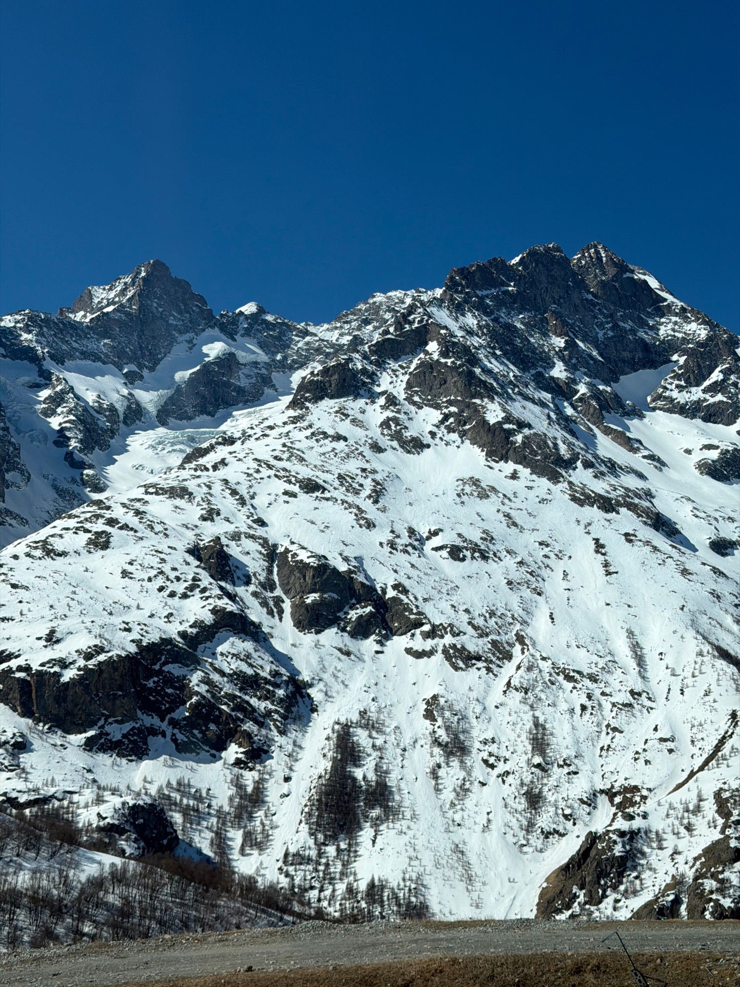 This image shows a snow-covered mountain range against a clear blue sky. The mountain has jagged peaks and steep slopes with a mix of snow and exposed rock. Vegetation is sparse, with patches of trees…read more