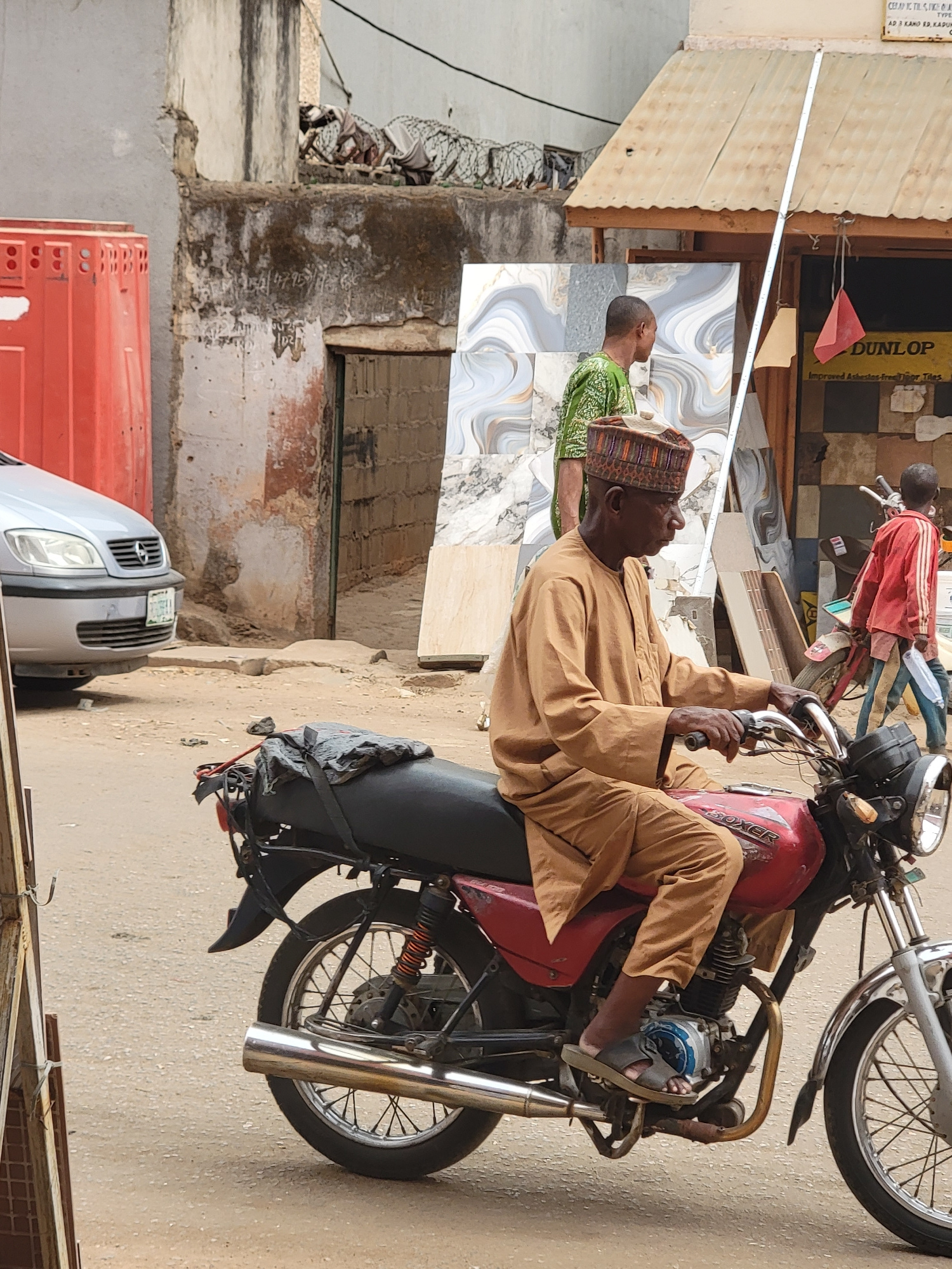 The image depicts a man sitting on a red "BOXER" motorcycle in what appears to be a street in Maiburiji, Nigeria. The man is wearing a brown outfit with a traditional hat. He's holding the handlebars…read more