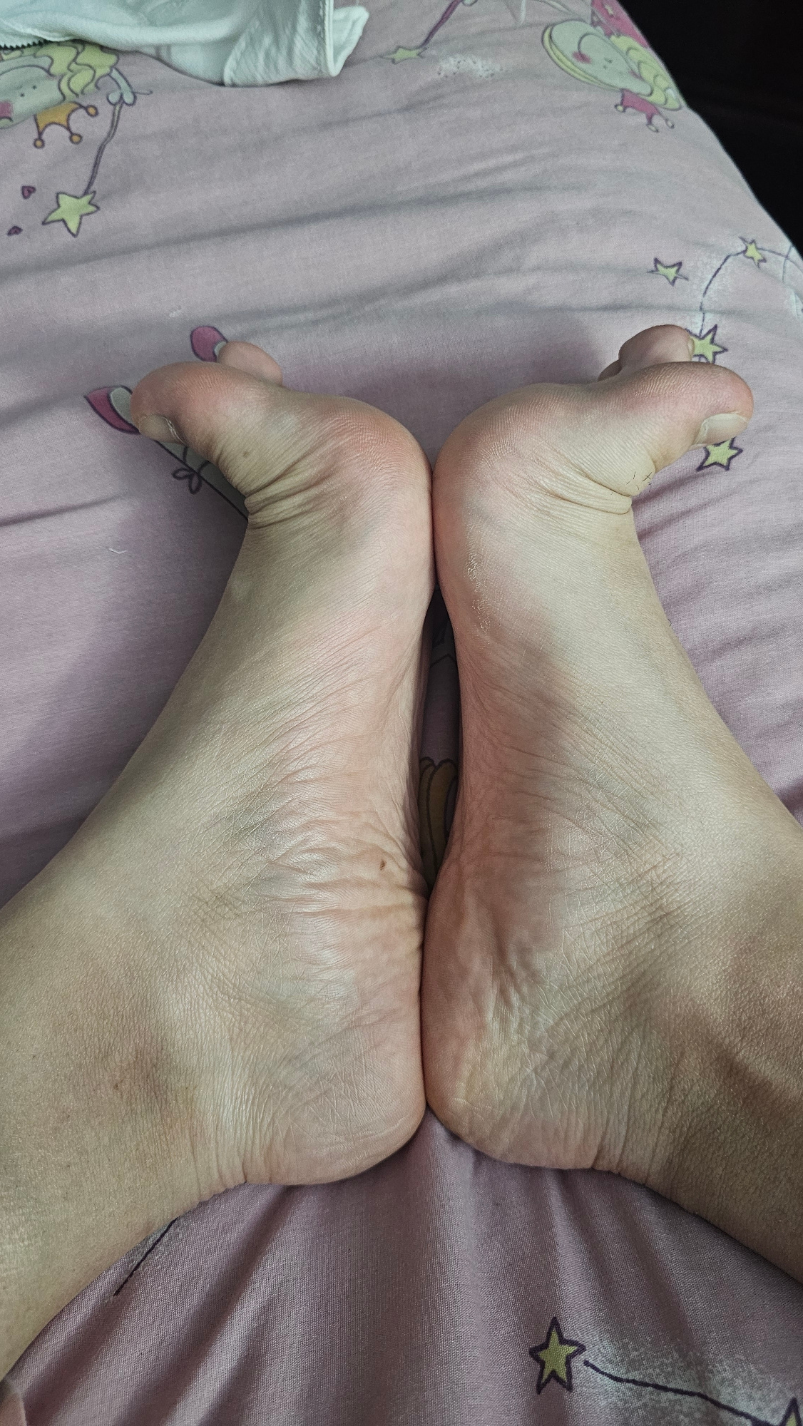 The image shows two human feet resting on a pink bedsheet with a cartoon print. The feet are pale, with visible wrinkles and skin texture on the soles. The toes are slightly flexed. The background isβ¦read more