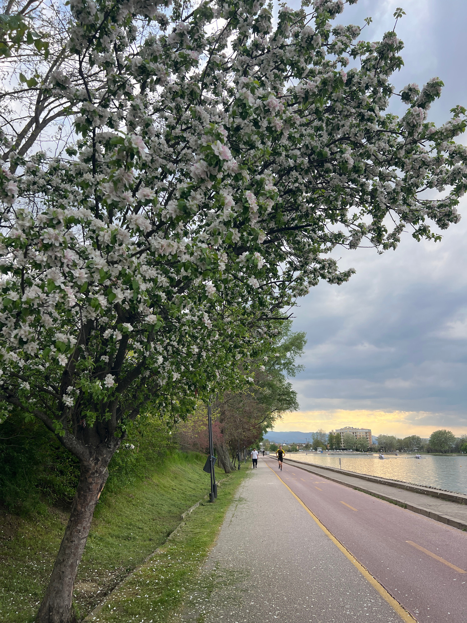 The image captures a vibrant spring scene along a riverside path in Plovdiv, Bulgaria. The photograph is oriented vertically, showing the horizon tilting diagonally from the bottom right to the top le…read more