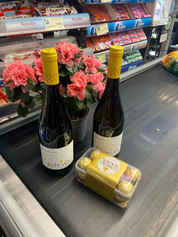 The image displays a supermarket checkout scene in the city of Bjeliši, Montenegro. On a black conveyor belt, a selection of items is positioned. These include two bottles of wine with yellow foil cap…read more