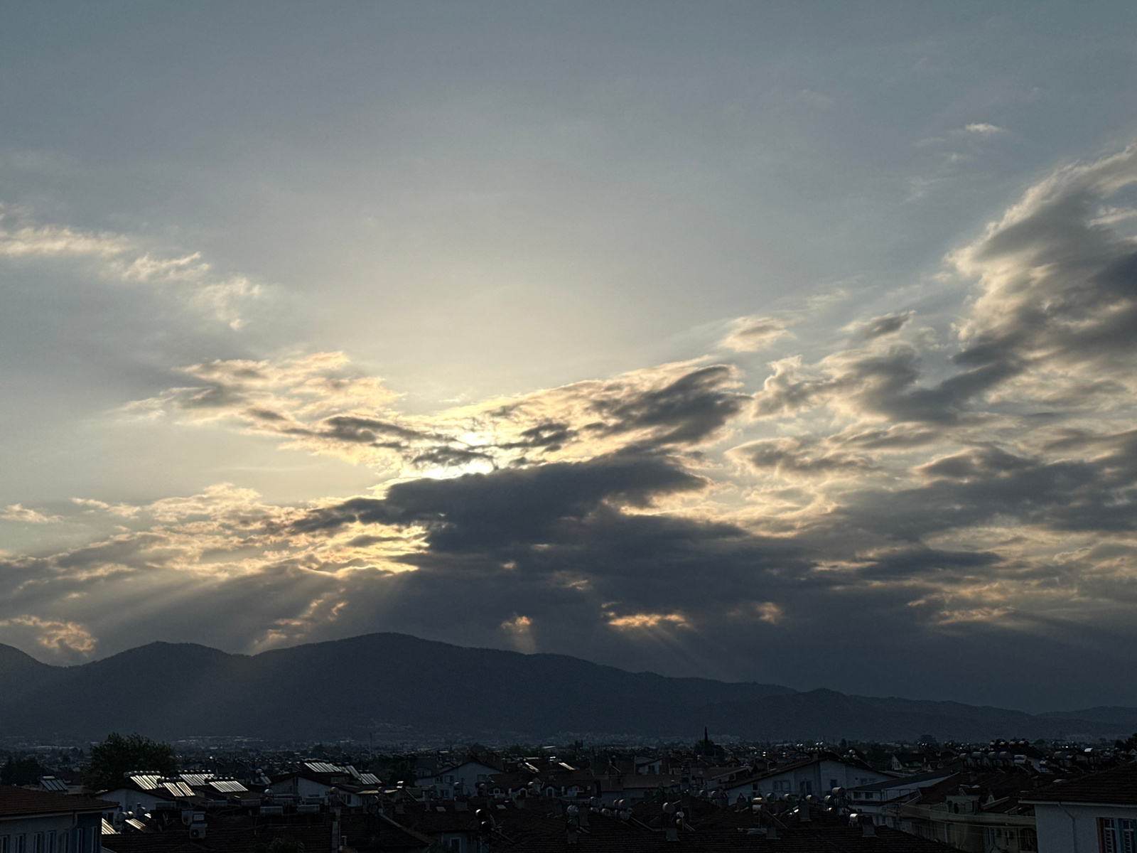 The image depicts a landscape view in Fethiye, Turkey. The scene is dominated by a sky filled with scattered clouds, with the sun partially obscured, casting crepuscular rays down onto the distant hil…read more