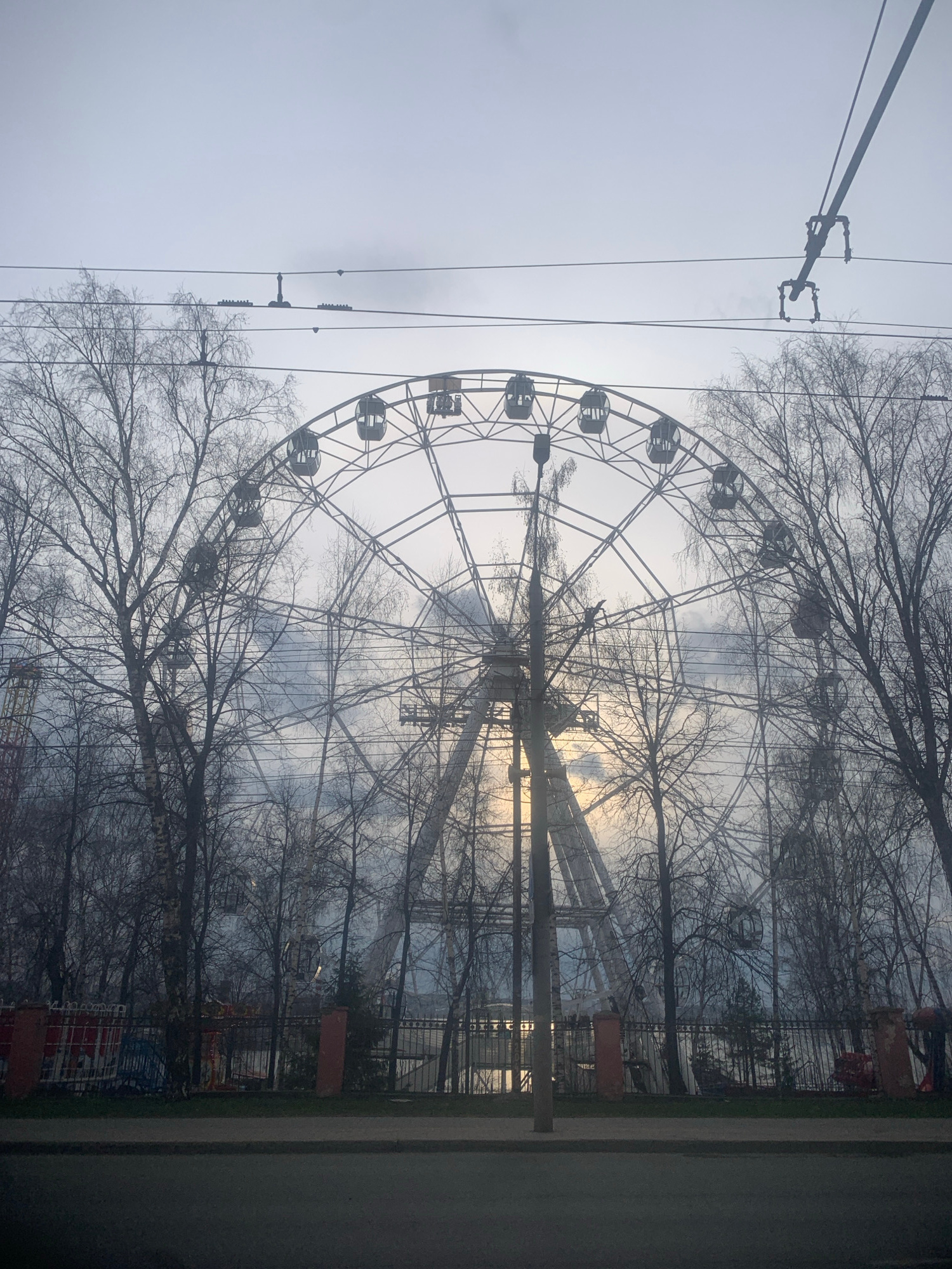 The image shows a Ferris wheel in a park in Izhevsk, Russia. The sky is overcast and the trees are bare, suggesting a cold or off-season time of year. Power lines are visible in the upper left corner…read more