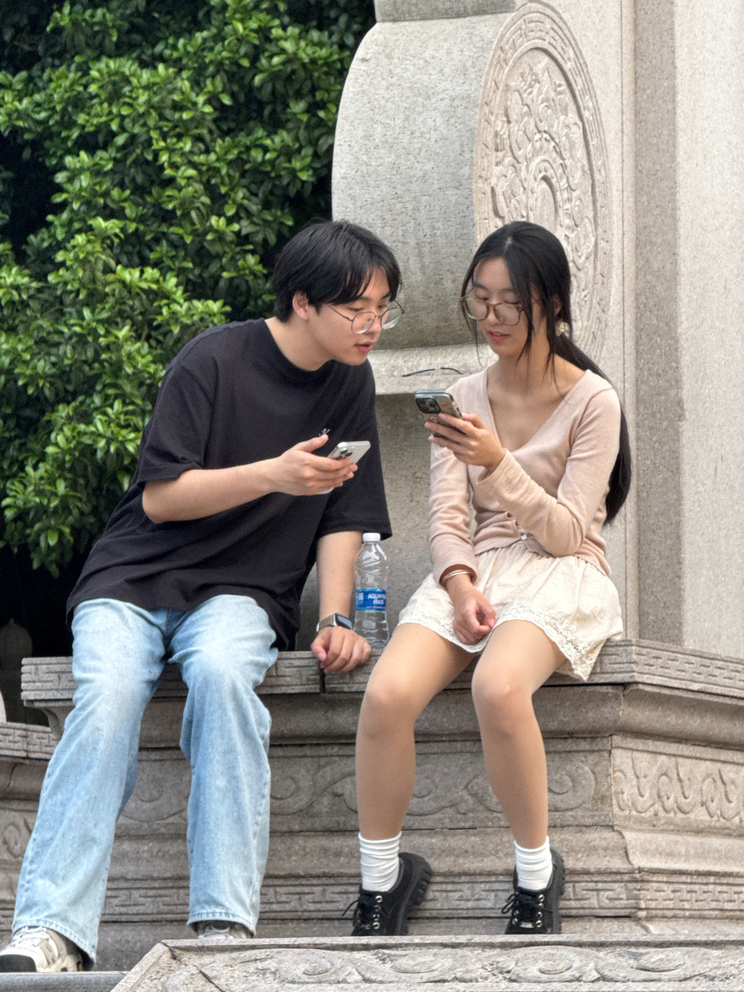 Two young adults are sitting on a stone structure. The woman is wearing glasses, a light pink long-sleeved top, and a white skirt with lace trim. She is holding a smartphone. The man is wearing glasse…read more